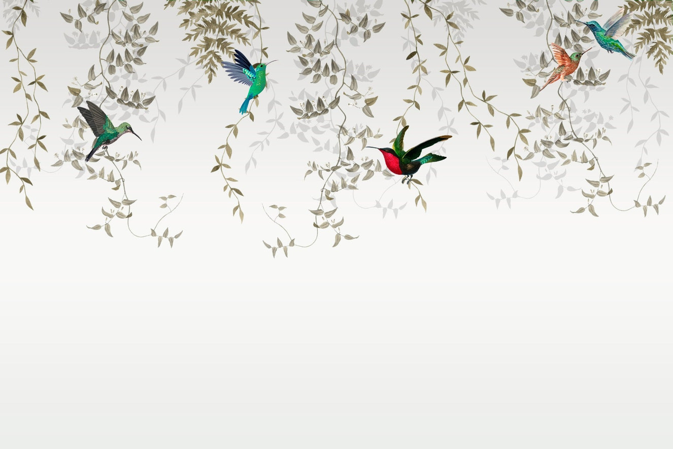 This tree and bird wallpaper expresses a soft outdoor scene. The trees carry birds on their branches, and the paper will look great in living areas or home offices where a calm and natural environment will offer you.