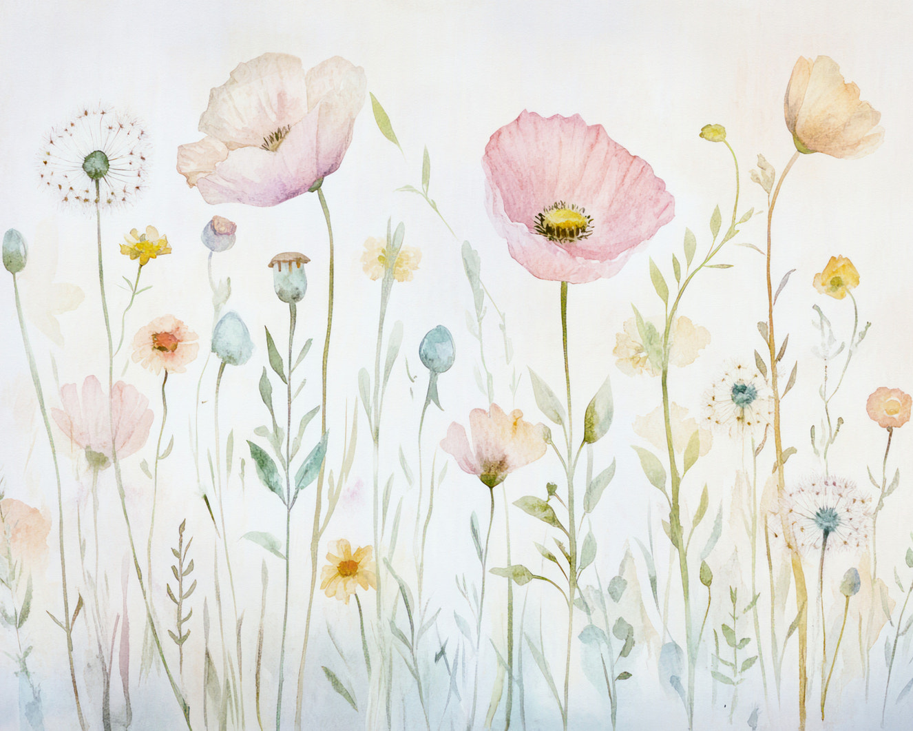 Scandinavian Watercolor Meadow Poppies with Gentle Wildflowers