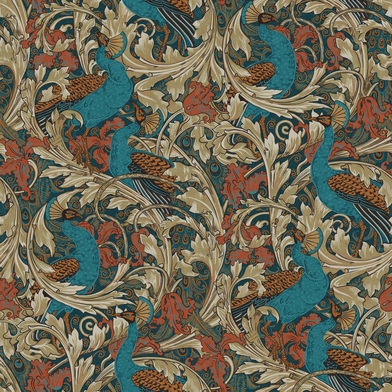 Peacock Garden by Walter Crane in teal rust mustard beige