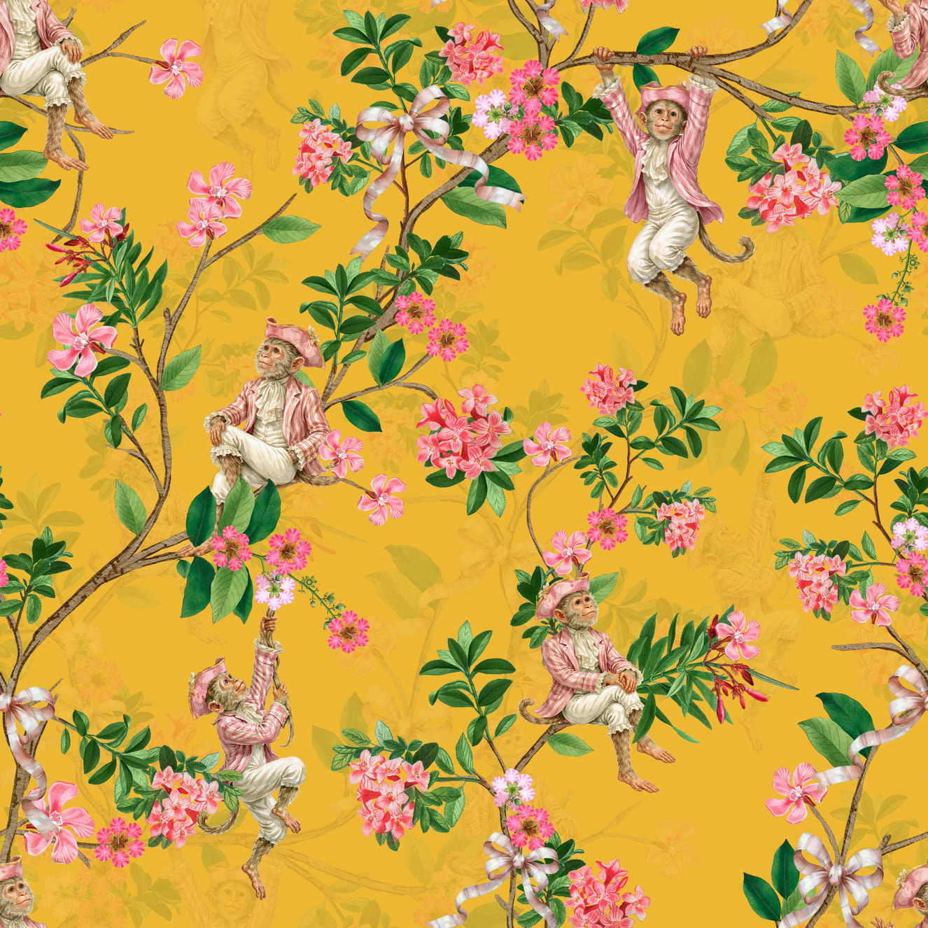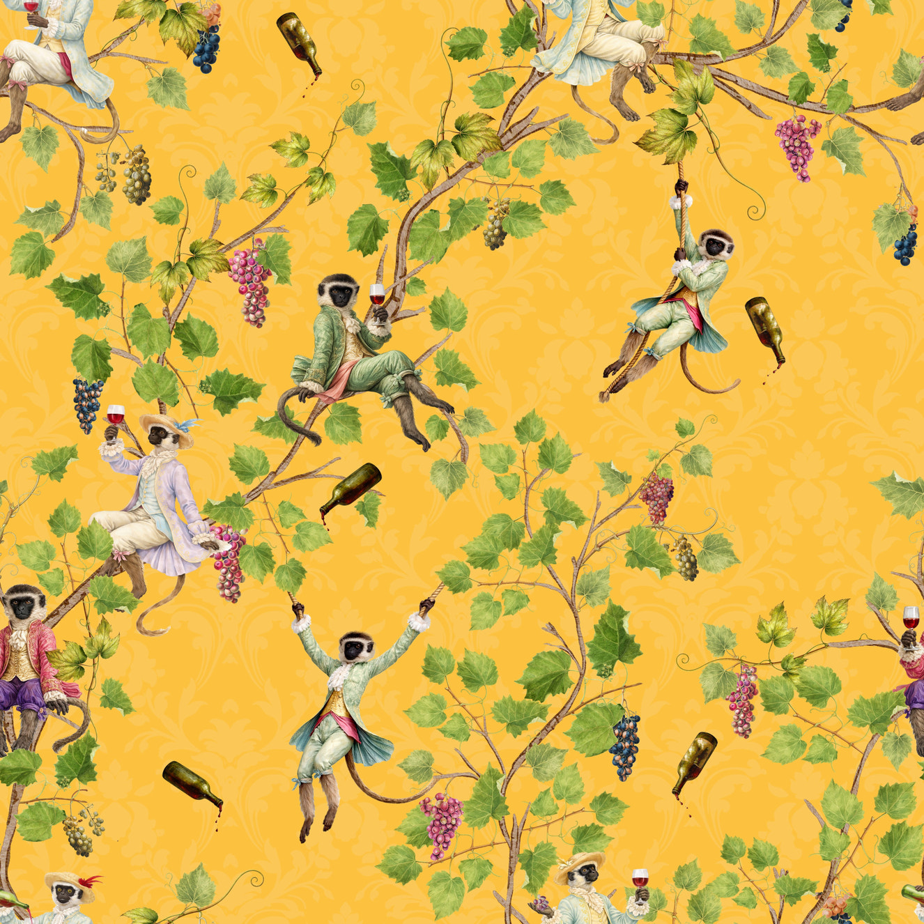Whimsical Playing Monkeys Family Vintage Exotic Garden yellow