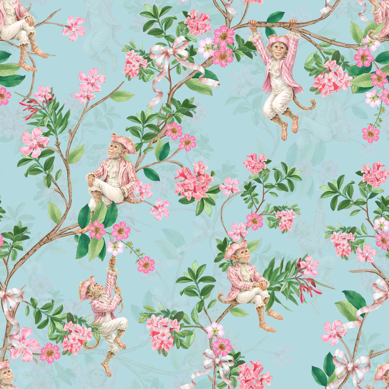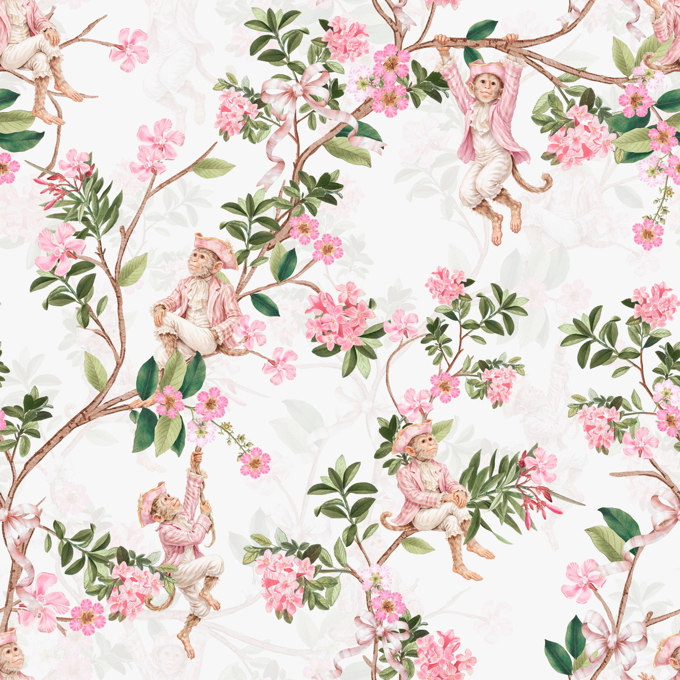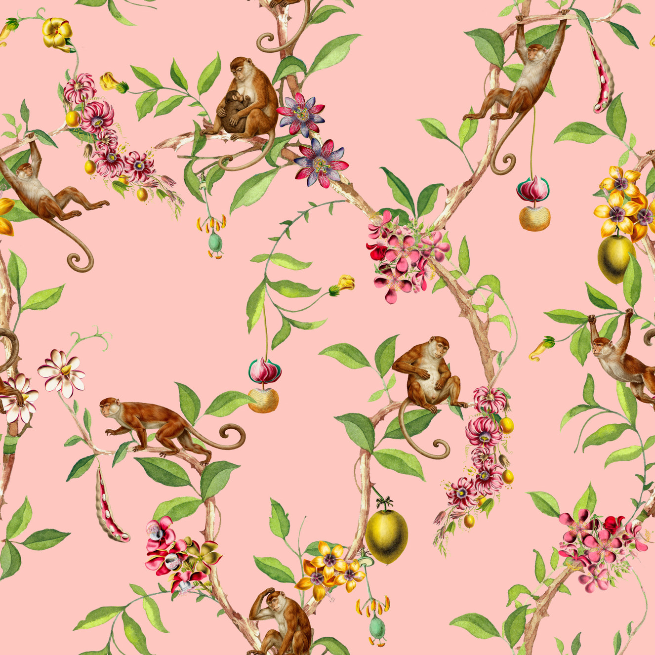 Whimsical Playing Monkeys Family Vintage Exotic Garden pink