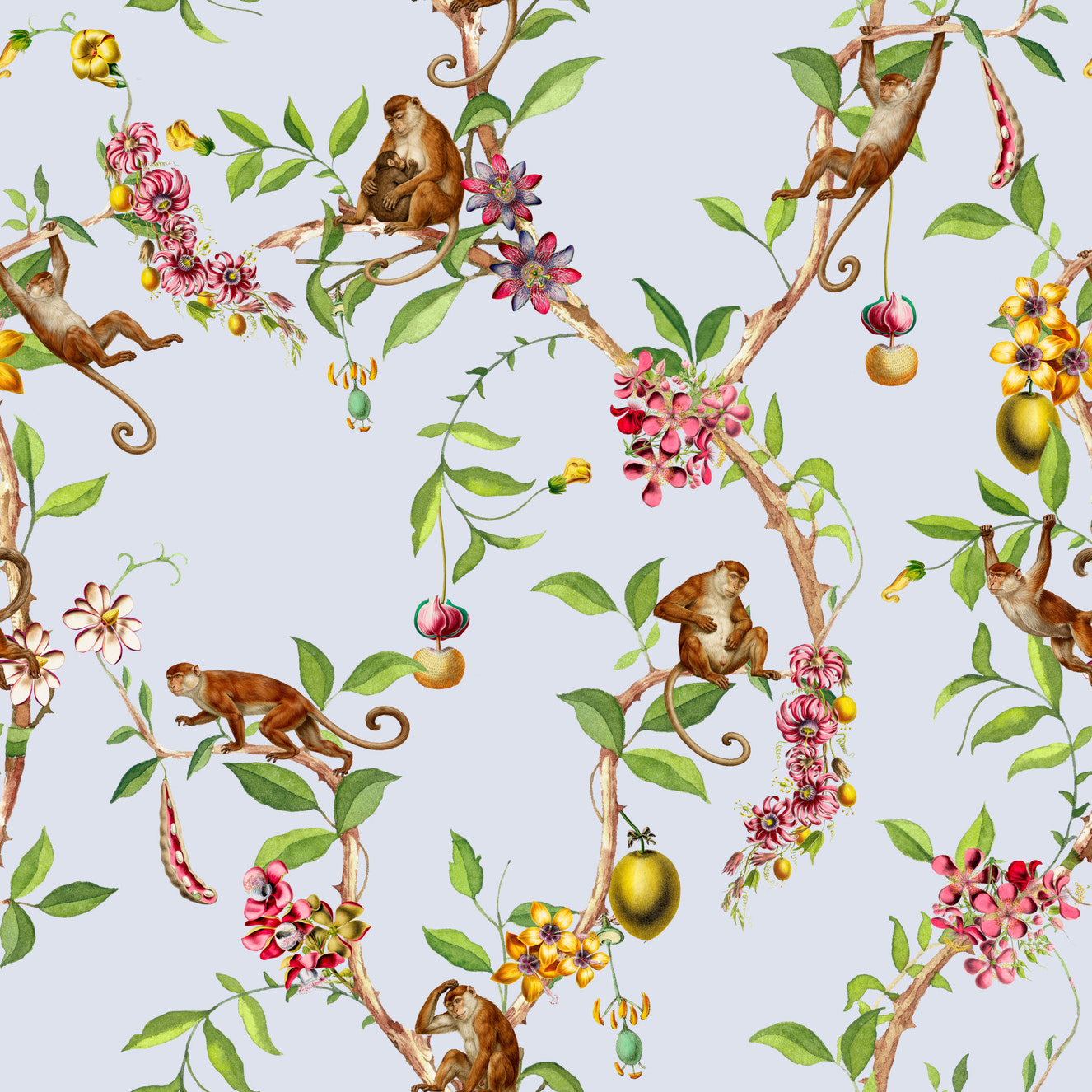 Whimsical Playing Monkeys Family Vintage Exotic Garden blue