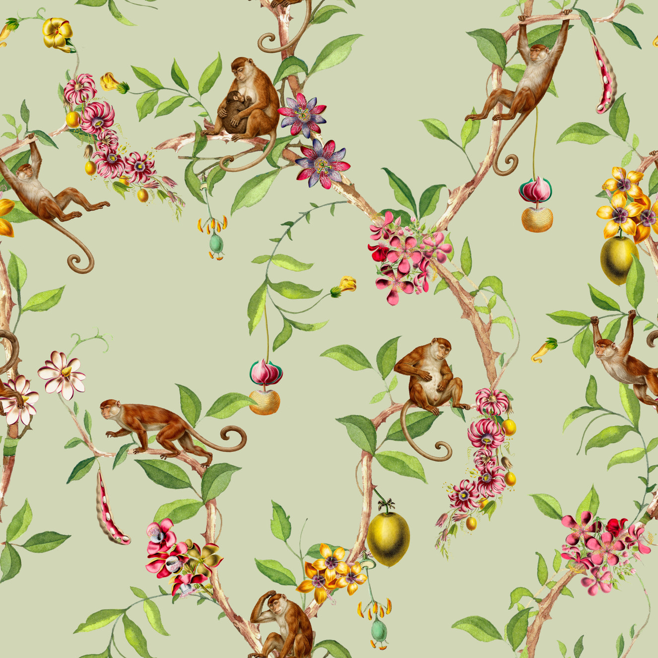 Whimsical Playing Monkeys Family Vintage Exotic Garden green