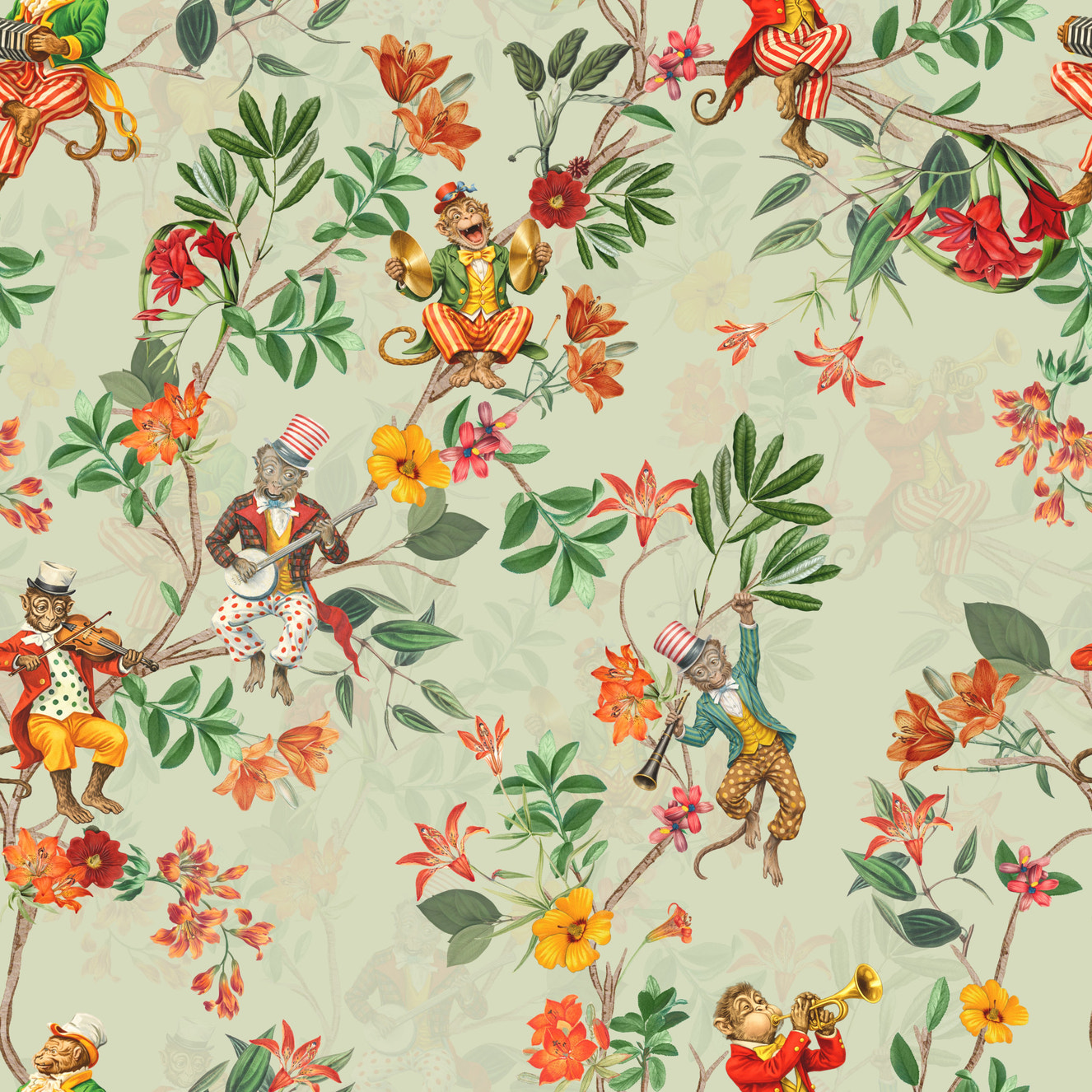 Whimsical Monkeys Playing Music Vintage Exotic Fun Garden green