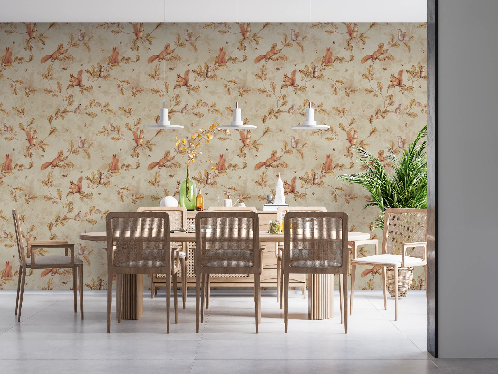 Immerse yourself in an enchanting 18th-century world with this whimsical wall décor by Uta Naumann. Inspired by the Rococo era and infused with Chinoiserie charm, the design features delicate oak tree branches adorned with golden leaves and plump acorns, all against a serene sand backdrop. Playful squirrels and dainty mice frolic amidst the foliage, creating a scene of lighthearted woodland fantasy. This design evokes a sense of sophisticated whimsy, ideal for adding a touch of historical elegance and natural beauty to any space. The detailed illustrations lend an air of timeless artistry, transforming your walls into a captivating narrative of nature's charm.