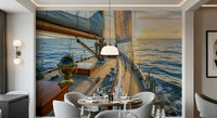Imagine the endless horizon with this captivating wallpaper for walls. The deck of a sailboat is the focal point, leading your eye to the meeting of sea and sky at sunset. The craftsmanship of the wooden deck, combined with the gleaming brass details, creates a feeling of luxury and adventure. Use this design to infuse your bedroom, living room or even a hallway with a serene, nautical vibe that enhances the interior space with a blend of comfort and maritime charm.