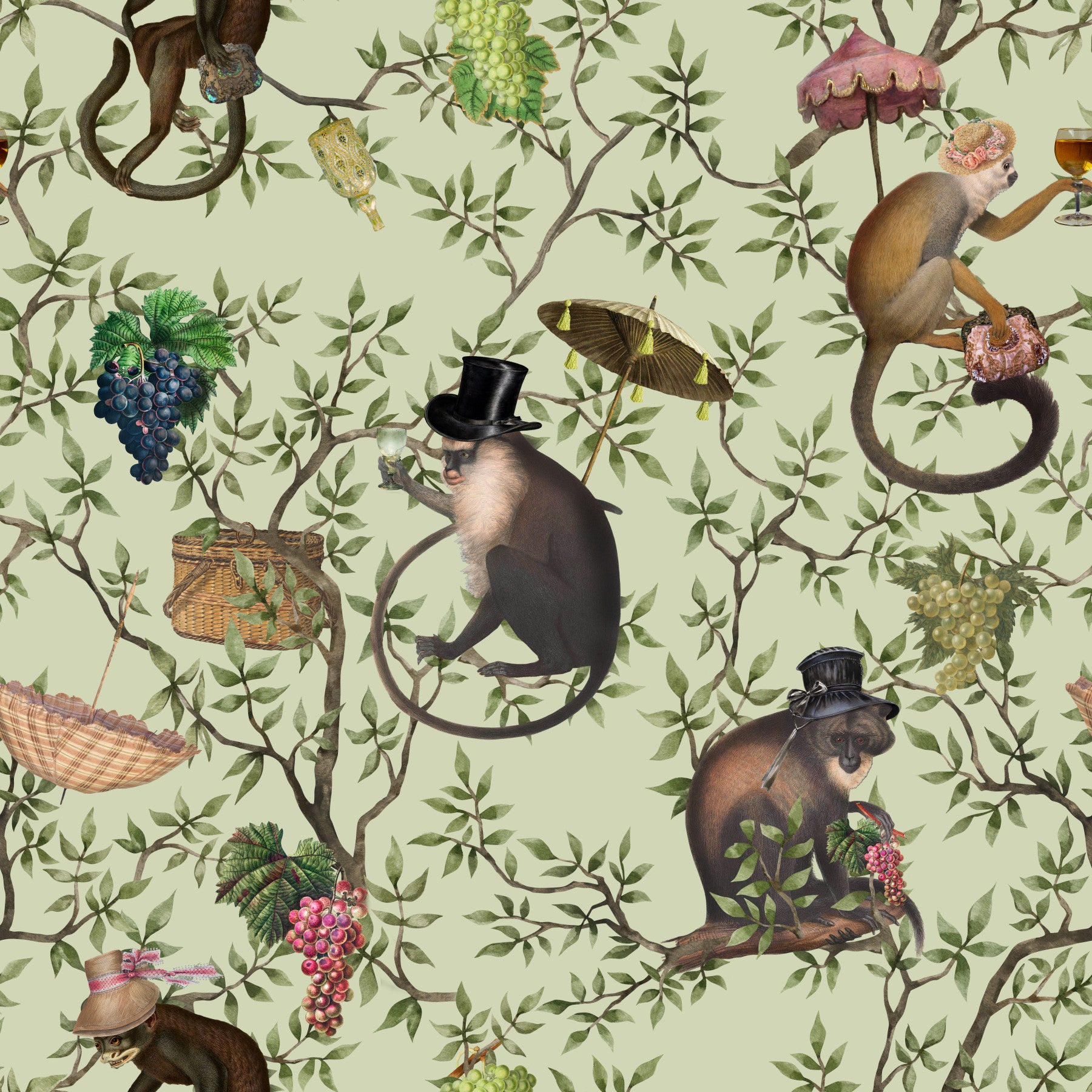 Escape to a world of refined elegance with 'A Primate's Afternoon Tea,' a unique wallpaper design showcasing stylish monkeys enjoying a delightful tea party amidst a picturesque garden setting. The delicate watercolor style brings a touch of vintage charm, with the pastel green background complementing the rich details of the monkeys' attire and the lush greenery. This wallpaper seamlessly blends playful animal motifs with sophisticated decor, creating an ambiance that is both whimsical and refined. Ideal for adding a touch of personality to any living space, this design brings an air of sophistication and lightheartedness to any room.