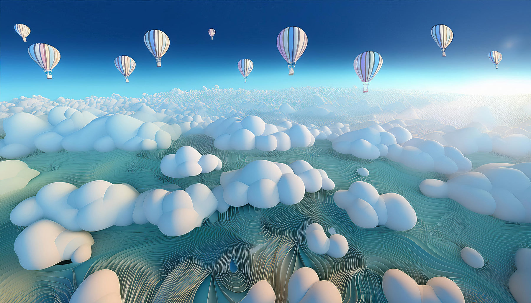 Drift away into a serene dreamscape with this imaginative wallpaper. Gentle hot air balloons painted in pastel stripes float gracefully across a sky of soft blue, overlooking an ocean of fluffy, white clouds. Below, the land unfolds in undulating teal lines, suggesting a tranquil sea or stylized fields. Perfect for creating a calming ambiance in any room, this wallpaper combines whimsy and tranquility, offering a refreshing escape from the everyday.