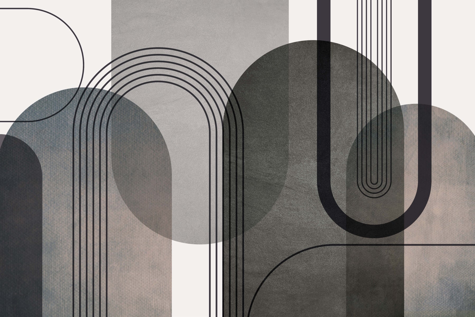 Embrace serenity with this minimalist wallpaper. 'Abstract Arches in Muted Tones' features a captivating interplay of muted grays, browns, and blacks. Overlapping semi-circular forms create a sense of depth and calm, while subtle textured backgrounds add visual richness. Clean lines and elegant arches form a sophisticated geometric composition, perfect for modern interiors seeking a tranquil and stylish atmosphere. This wallpaper effortlessly blends sophistication with a sense of quiet contemplation, transforming any space into a haven of understated elegance.