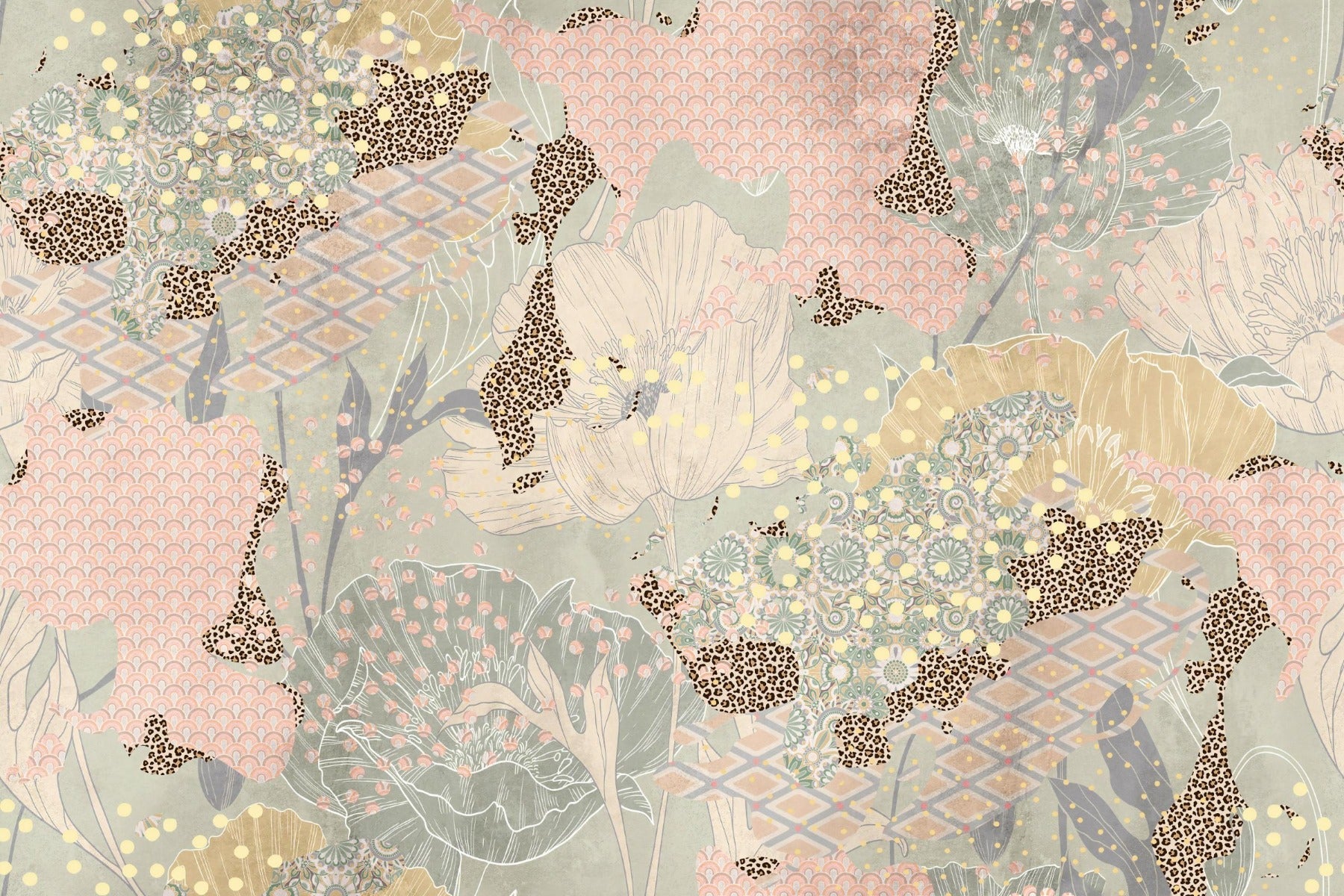 Elevate your living space with our Boho Artistic Wallpaper Murals, a tapestry of design that infuses your home with the essence of bohemian artistry. Every glance reveals a kaleidoscope of details, from the bold floral patterns to the subtle pastel hues, and the daring animal print motifs. This intricate abstract pink boho wallpaper design harmoniously blends various patterns to create a wallpaper mural that's both rich in texture and visually captivating without overwhelming your senses.