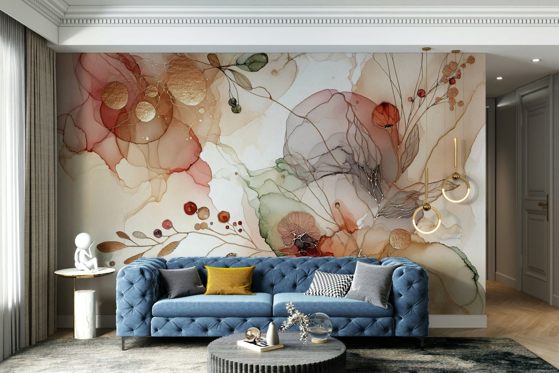 This wallpaper showcases a breathtaking abstract floral design created using alcohol ink. The soft, flowing forms of muted pinks, browns, and greens are elegantly accented with delicate gold leaf detailing. The overall effect is one of serene beauty and sophisticated tranquility, creating a calming and elegant atmosphere in any room. The interplay of light and shadow within the organic shapes evokes a feeling of warmth and gentle movement, making it ideal for spaces where relaxation and peace are desired. The gold accents add a touch of luxurious elegance, elevating the piece beyond the purely abstract.