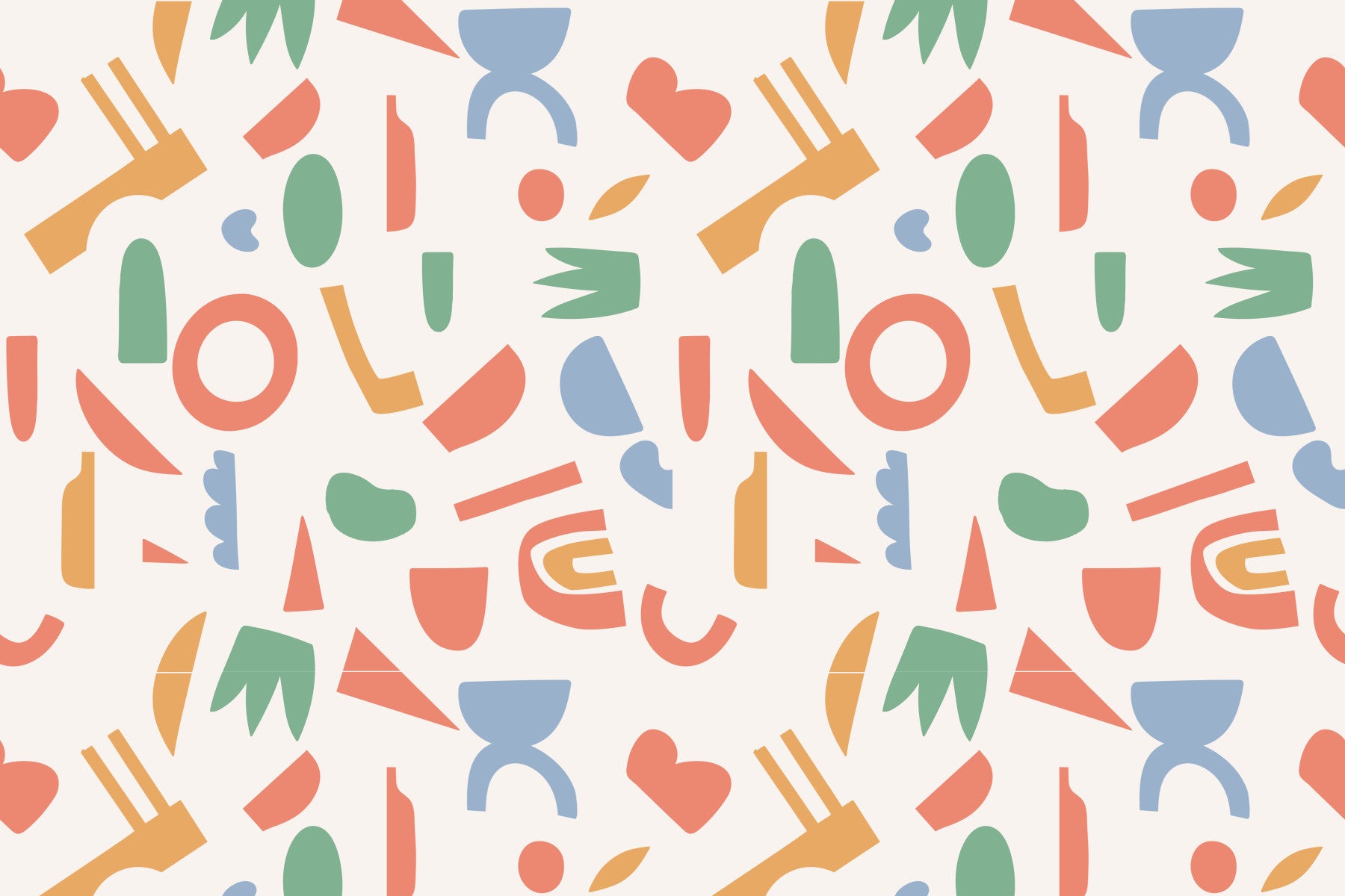 Create a statement with this engaging wallpaper showing harmonious abstract forms. This design blends coral, sage green, sky blue, and sunshine hues. Ideal for spaces needing visual interest, like a home office, playroom, or kids bedroom. The design includes circles, triangles, and organic shapes over a light base. This wallpaper for walls enhances spaces with a blend of fun and sophistication. Elevate interiors and make a positive statement with this cheerful backdrop.
