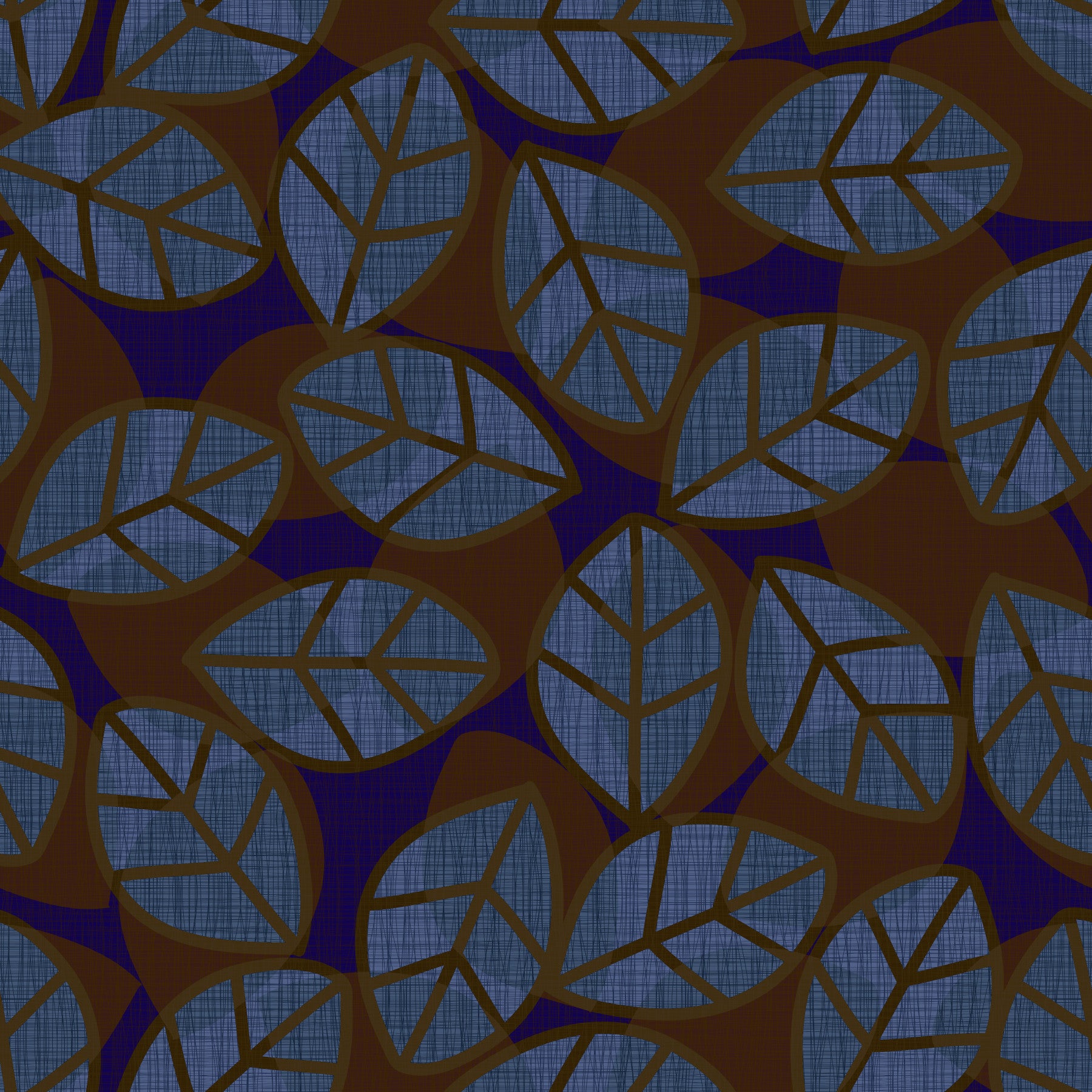 Immerse yourself in the enigmatic beauty of 'Abstract Leaves Dark,' a wallpaper that blends the familiar forms of nature with a subtly mysterious ambiance. This design features stylized leaf shapes, outlined in a deep brown, that create a captivating interplay of geometric abstraction. The interiors of the leaves are filled with a textured dark blue, evoking a feeling of twilight forests and hidden depths. These bold leaf shapes overlap across a deep indigo background creating a sophisticated and calming visual experience. Perfect for adding a touch of natural elegance and subtle drama to any space, 'Abstract Leaves Dark' offers a modern take on organic motifs, providing a statement piece that is both stylish and thought-provoking. Let this wallpaper transform your screen into a window to an artistic, nocturnal garden.