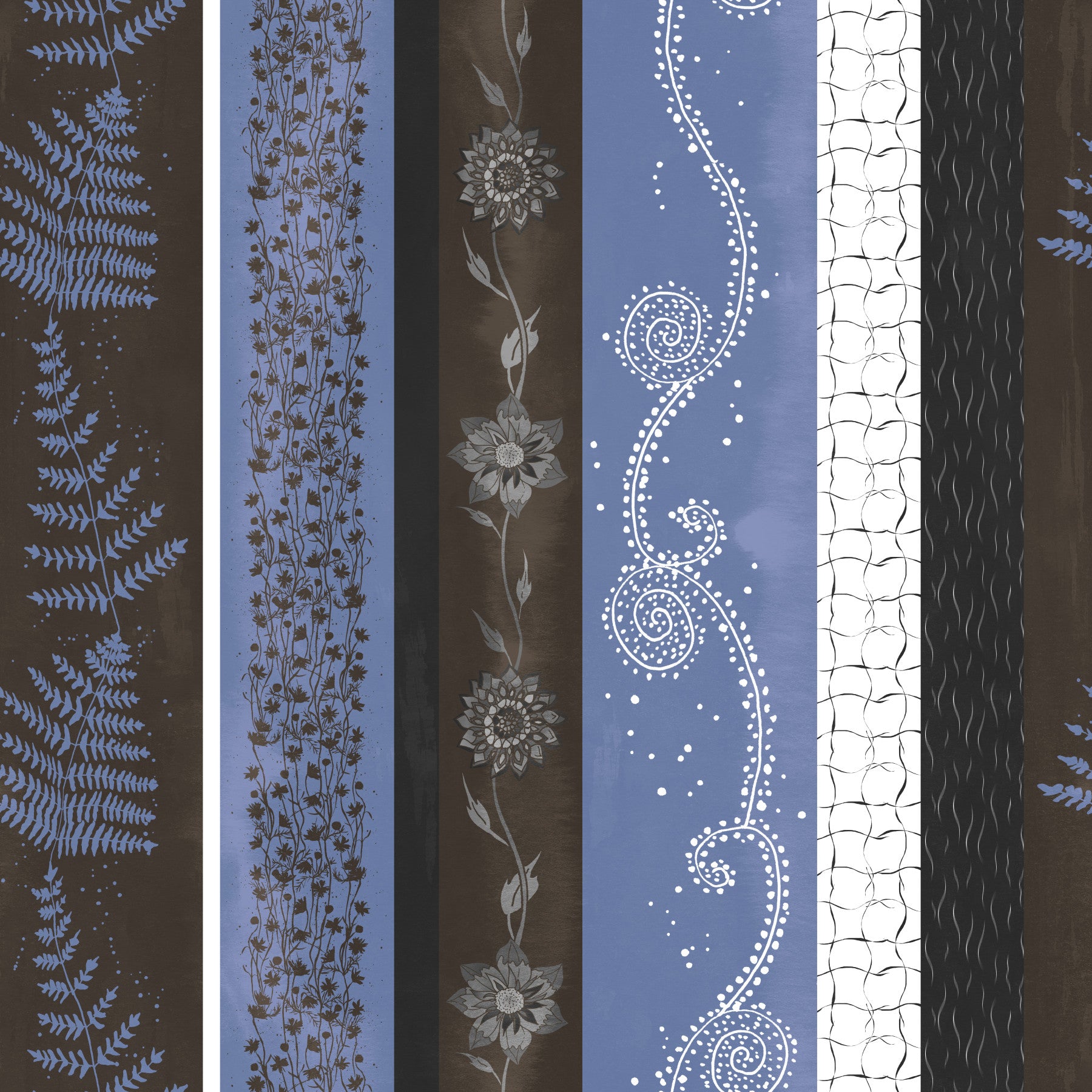 This wallpaper is an Abstract Nature Stripes Blue Copper design, a unique repeating pattern with a sophisticated and artistic style. It's a great wallpaper for walls for a living room, study, or any space that needs a modern feel. The design features vertical stripes with different abstract nature elements like ferns, flowers, and swirls. Made from high-quality, durable material, this wallpaper is a simple and quick way to refresh your home decor with a one-of-a-kind look.