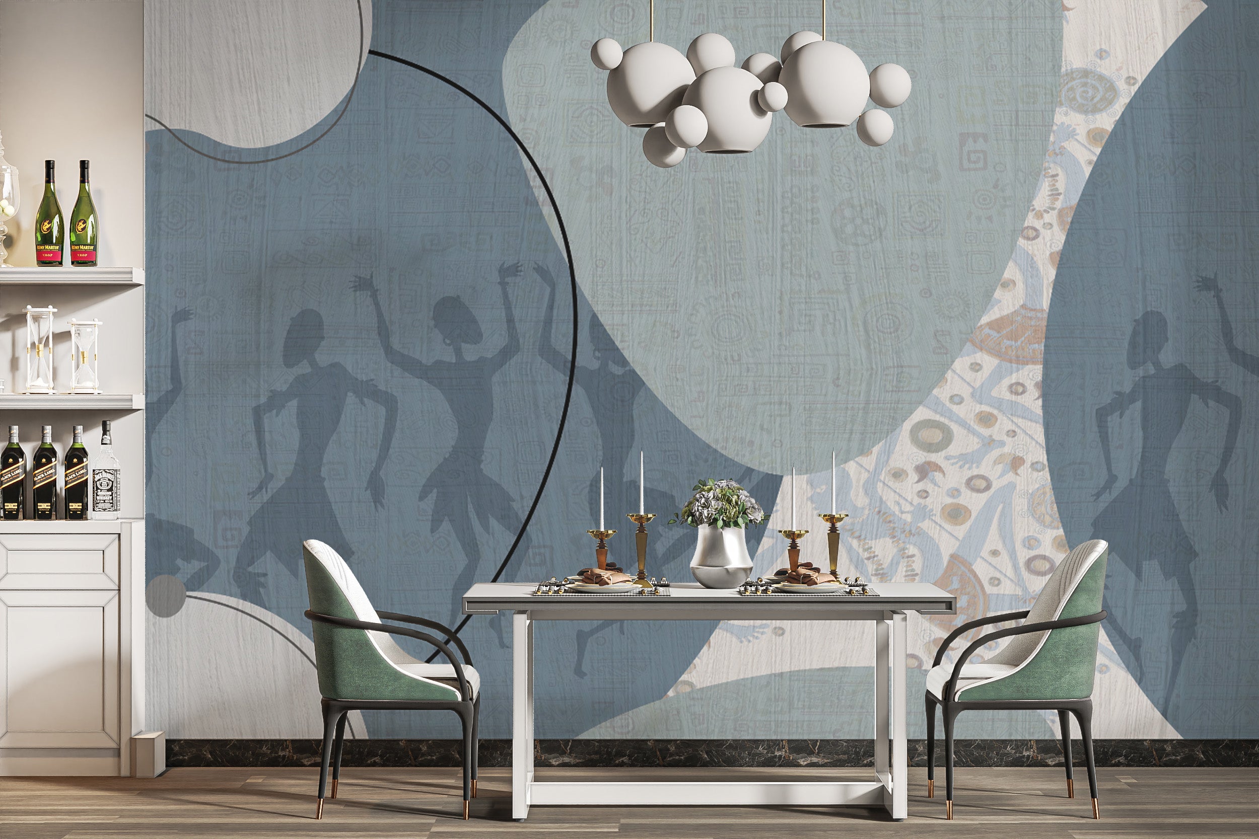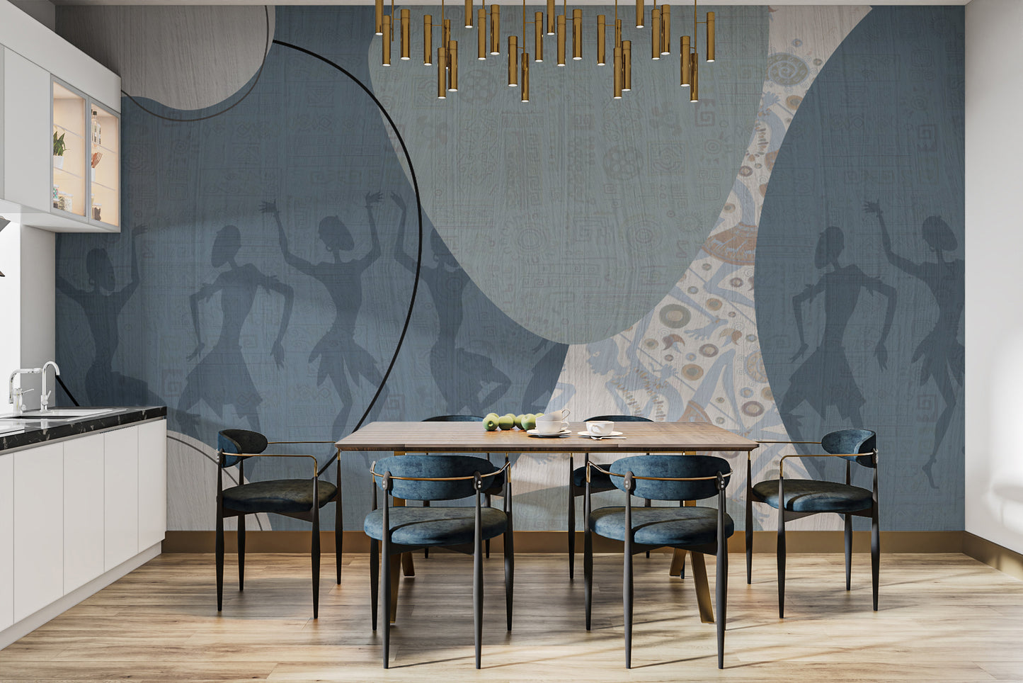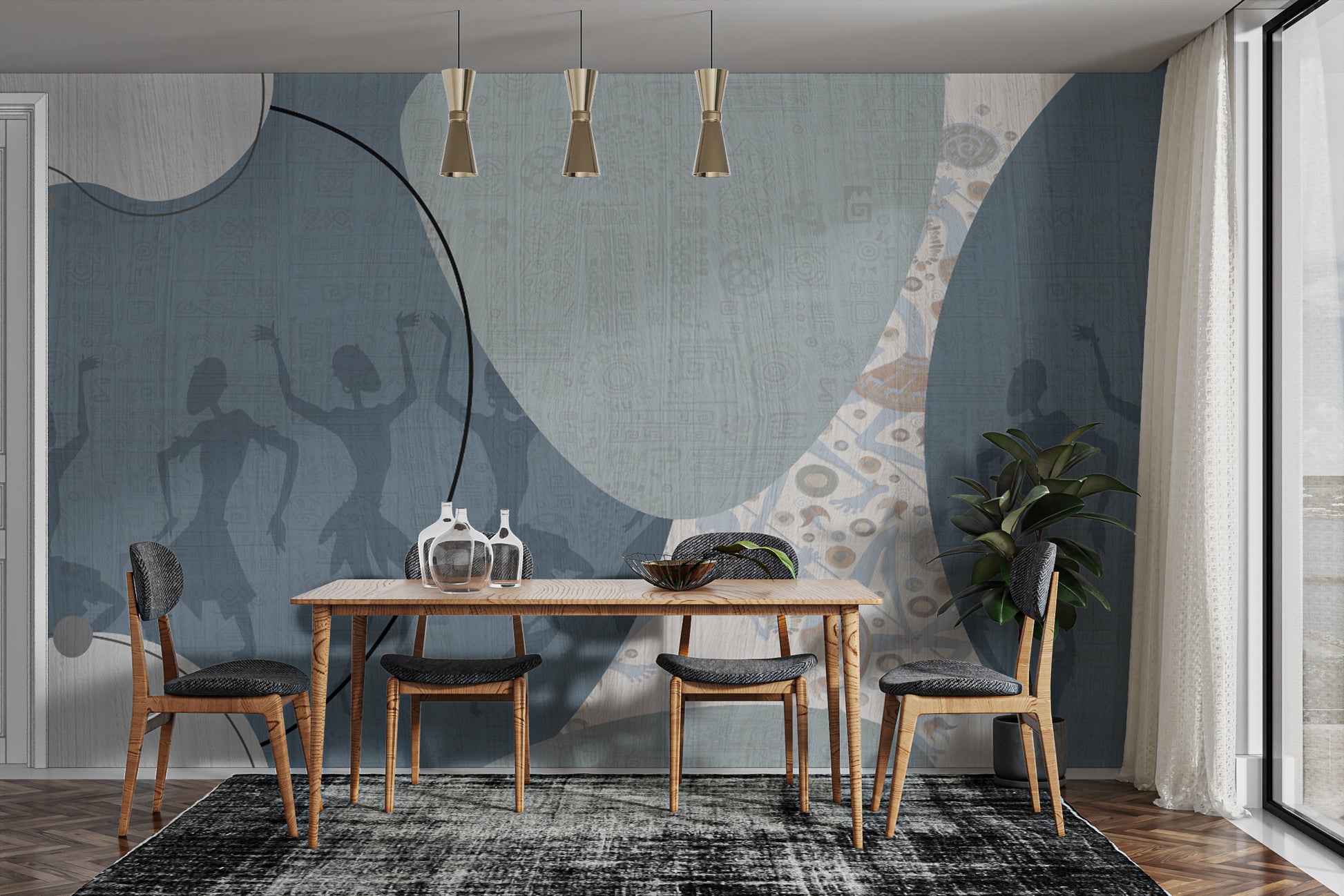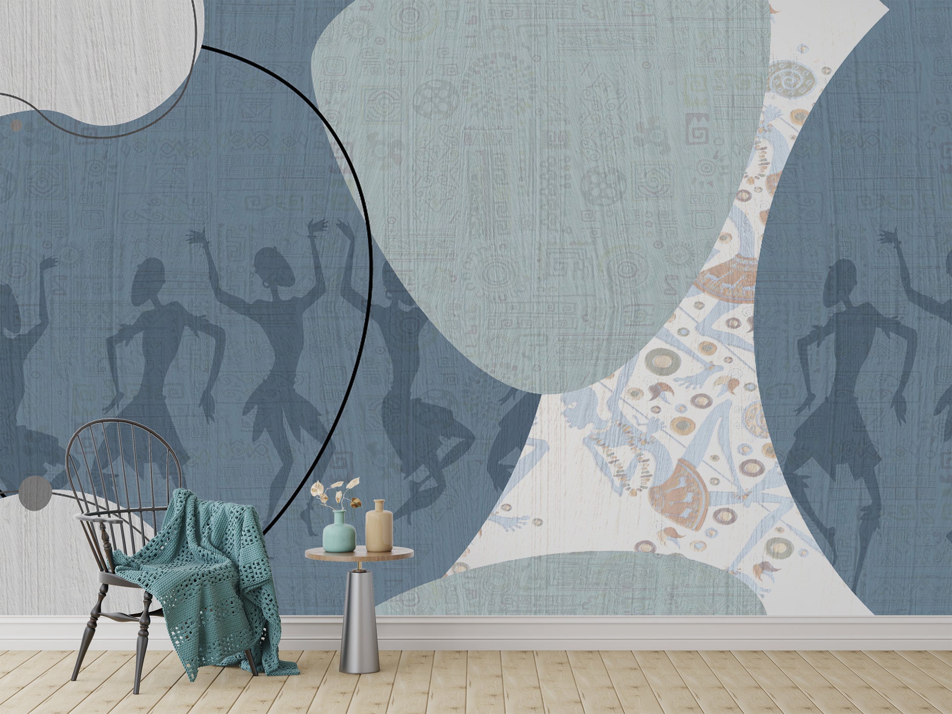 Rhythmic movement and cultural symbolism define this abstract tribal dance wallpaper, blending fluid silhouettes with geometric patterns. Inspired by traditional dance forms, this design features earthy blues, soft neutrals, and dynamic tribal figures that add depth and energy. The layered textures and organic shapes create a striking yet balanced aesthetic, making it an ideal choice for living rooms, studios, or creative spaces. Perfect for bohemian, rustic, or contemporary interiors, this wallpaper pairs artistic abstraction with heritage influences. Crafted using high-quality materials, it ensures durability and a smooth matte finish. Let expressive dance figures bring a bold artistic statement.
