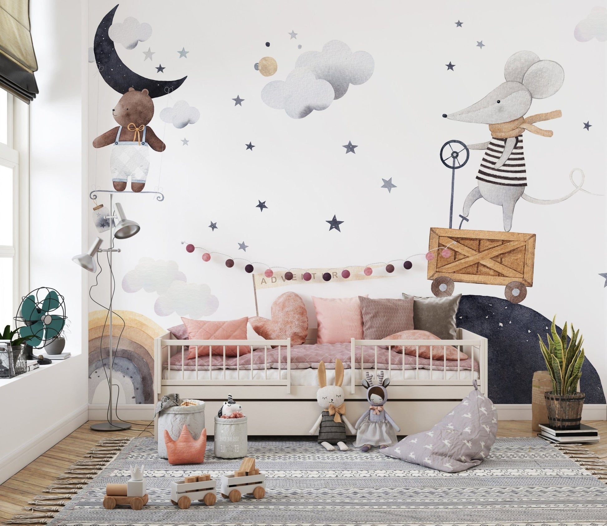 Turn your child’s room into a whimsical wonderland with the Adventure in the Sky mural. This enchanting children wallpaper features a charming mouse on a wooden cart, a bear swinging from the moon, and a dreamy sky filled with stars, clouds, and adventure. Perfect for nurseries, bedrooms, or play areas, its soft pastel tones and hand-painted watercolor style spark imagination and storytelling. Easy to install and remove, this peel and stick mural transforms any wall into a magical scene. Let your little dreamer explore the sky every day with this delightful and calming addition to their special space.