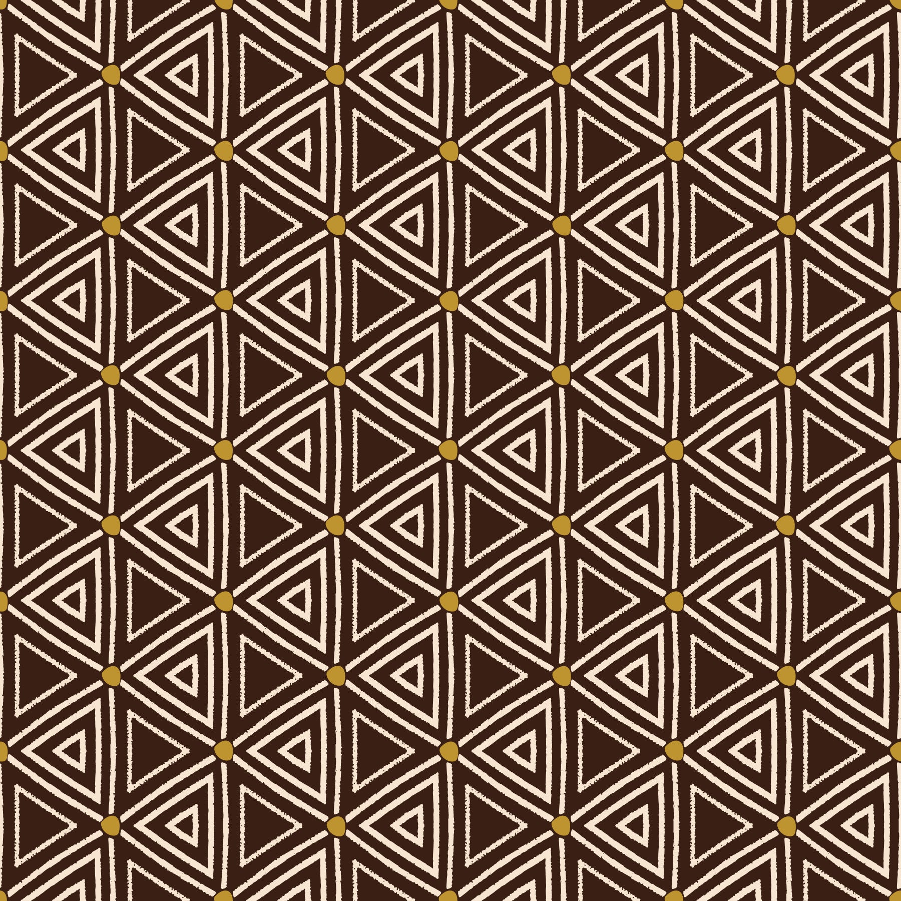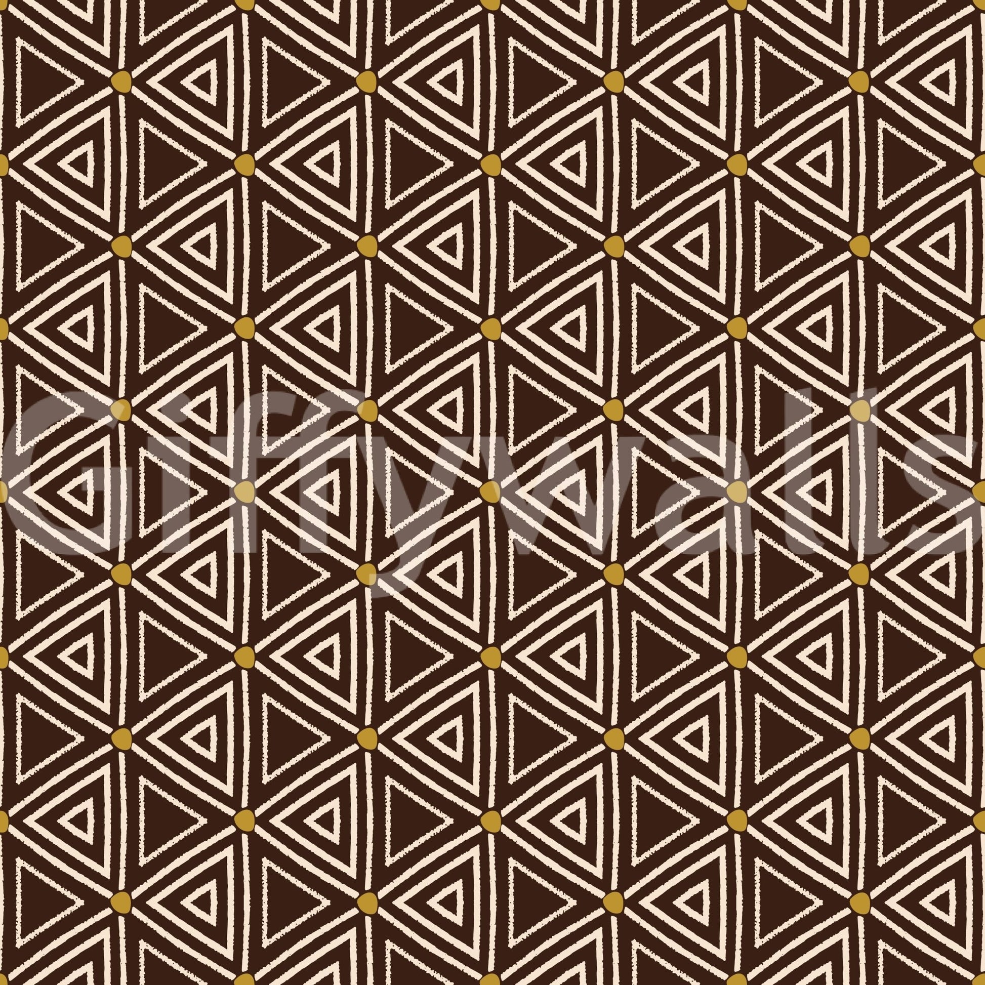This wallpaper is a celebration of African tribal art. The design features a rich brown background, punctuated by a mesmerizing pattern of interlocking beige triangles adorned with small, golden-yellow dots. The slightly rough texture of the lines gives it an authentic handcrafted feel, as if woven into a rich tapestry.
