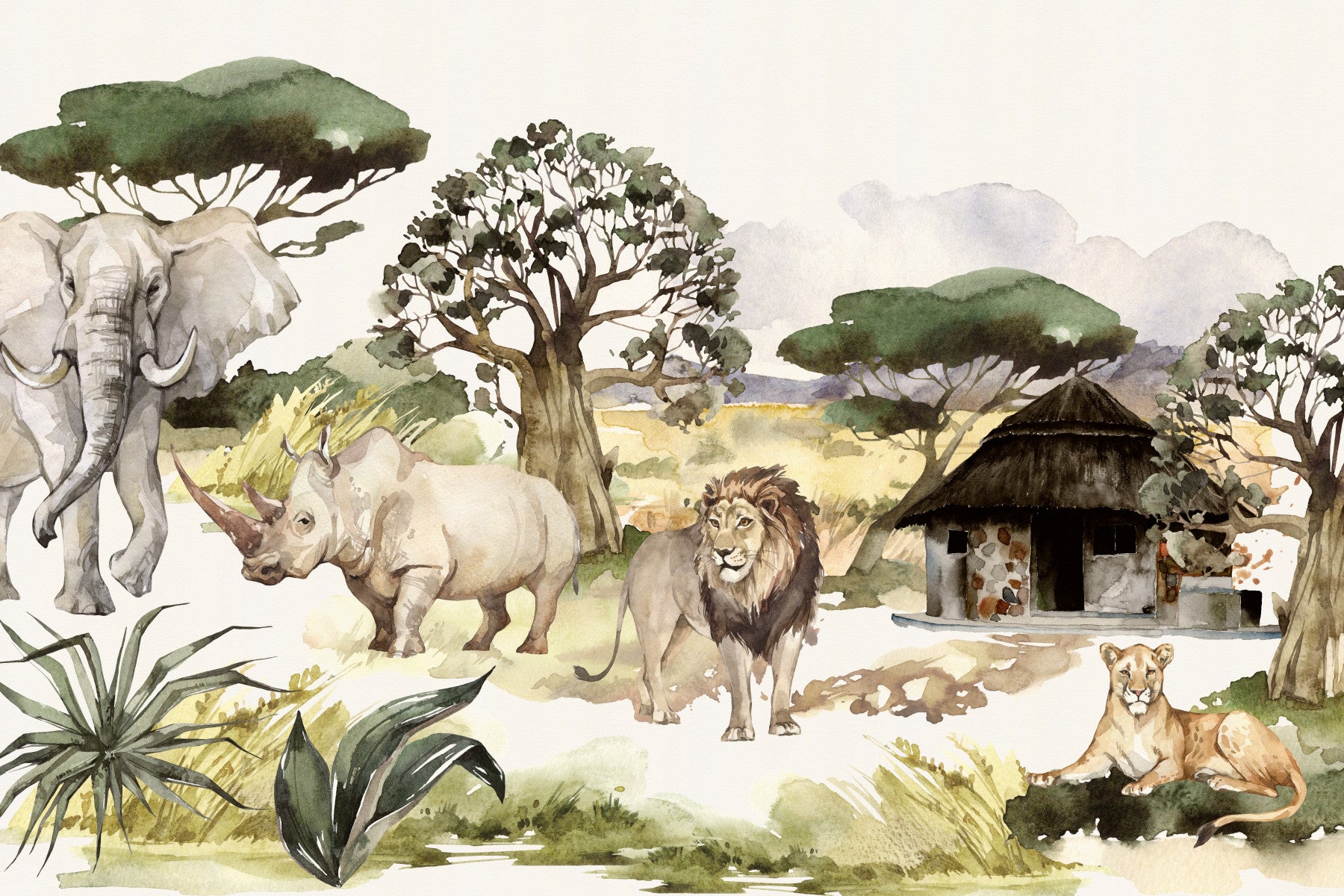 Experience the untamed beauty of Africa with this captivating watercolor wallpaper. The serene scene features an impressive array of wildlife, including elephants, a rhinoceros, a majestic lion, and a graceful lioness, all rendered in a beautifully nuanced palette of earth tones and greens. The composition, complete with characteristic African trees and a traditional hut, evokes a sense of peaceful coexistence between nature and human life. The delicate brushstrokes and soft watercolors create an aura of calmness and wonder, making this a striking and elegant addition to any home décor, ideal for creating a relaxing and inspiring atmosphere.