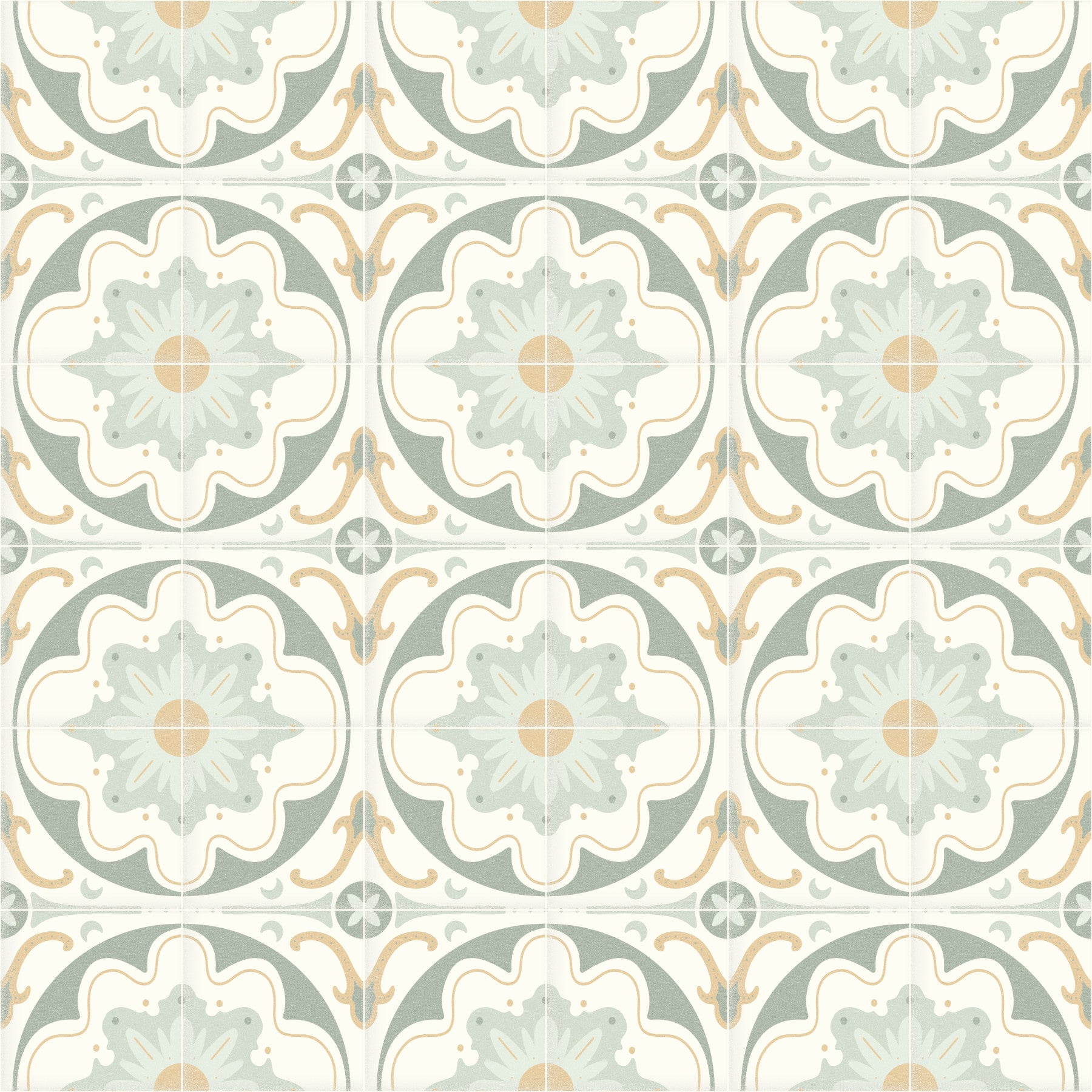 Evoke a sense of timeless charm with 'Aged Cement Tile Backsplashes - Sage'. This wallpaper design brings the subtle elegance of aged cement tiles to your screen, bathed in a soothing sage green hue. The pattern showcases intricate floral medallions within a structured grid, creating a visually captivating and balanced aesthetic. Delicate gold accents outline the designs, adding a touch of understated luxury. The textured appearance mimics the look and feel of real cement, lending depth and character to any digital space. Perfect for adding a touch of vintage sophistication and tranquility to your desktop, tablet, or phone, this wallpaper creates a serene and stylish backdrop, seamlessly blending classic design with a modern sensibility. Let the gentle colors and refined pattern transform your device into a statement piece, reflecting your appreciation for enduring beauty.
