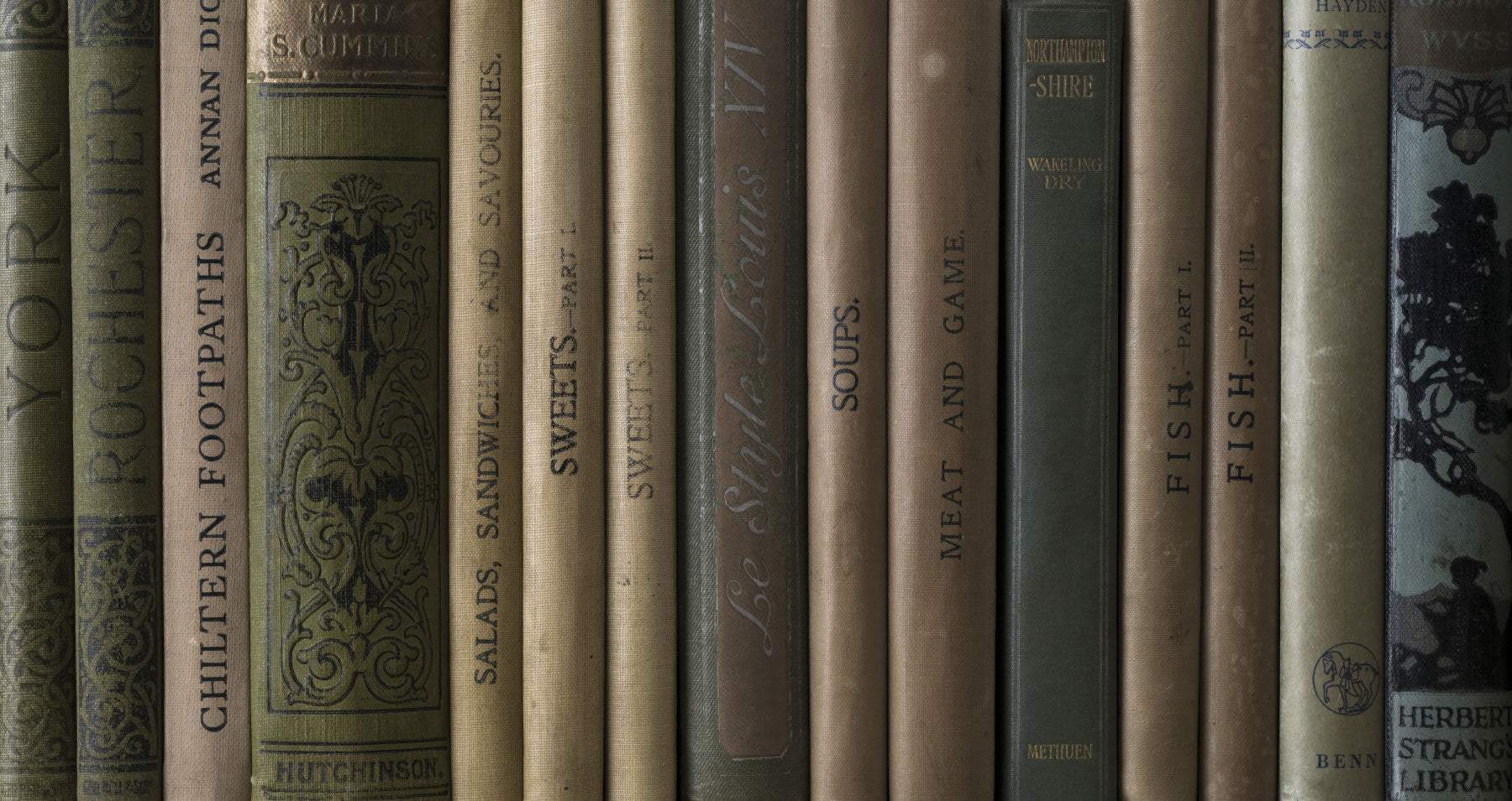 Vintage cooking books on shelf on Aged Editions wallpaper for walls.
