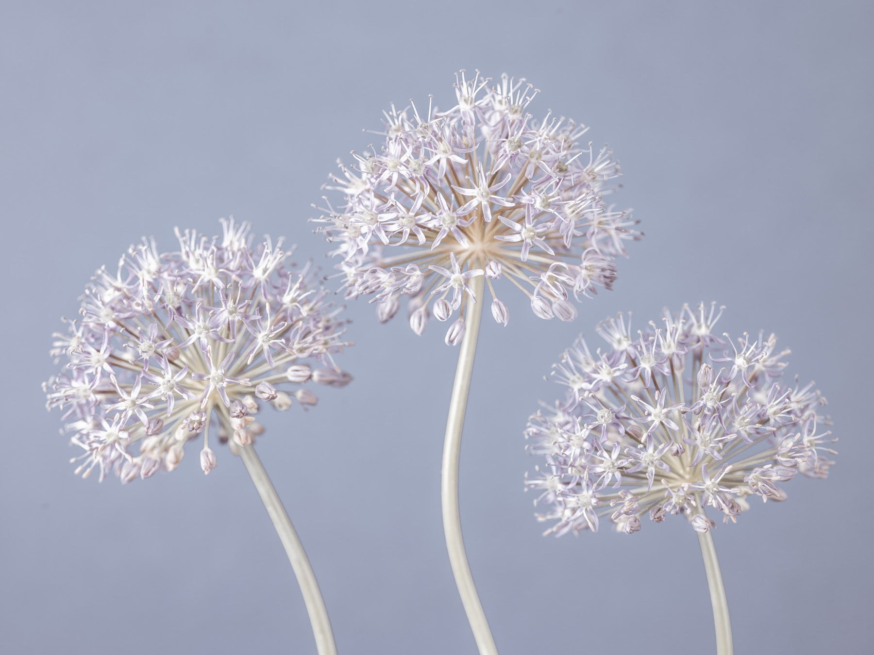 Three Alliums on blue background. Embrace the understated elegance of 'Allium Triplet', a minimalist wallpaper that brings a touch of natural serenity to your digital space. This captivating image showcases three ethereal Allium flower heads, their delicate, star-like florets rendered in soft, pastel hues against a calming, muted background. The composition is clean and uncluttered, inviting a sense of tranquility and balance. Perfect for those who appreciate subtle beauty, 'Allium Triplet' offers a refined aesthetic that complements any screen. Let these botanical orbs create a peaceful and harmonious backdrop, transforming your device into a haven of calm sophistication. Add a floral accent with this wallpaper and experience the beauty of the Allium family.