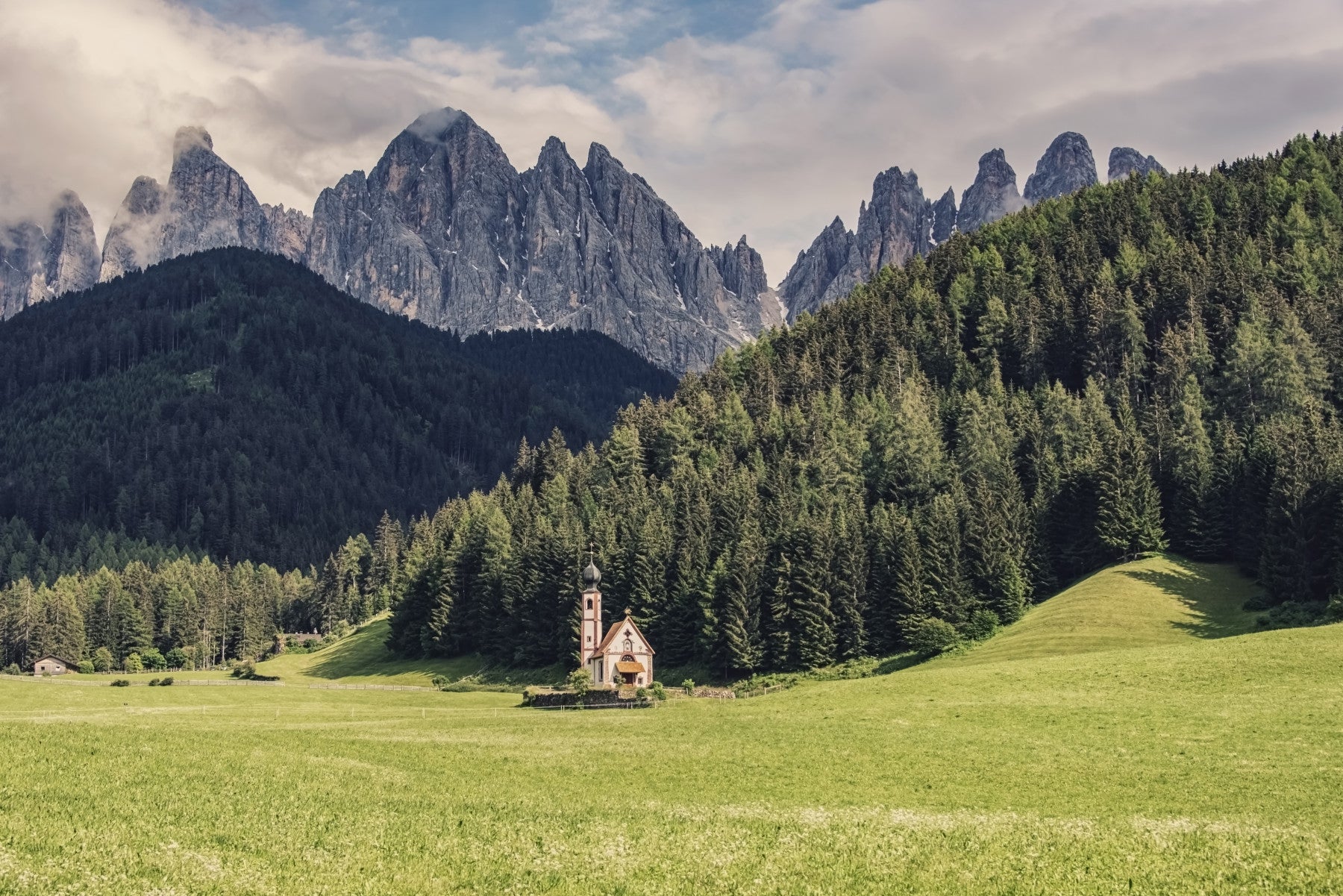 Bring the majesty of the Alps into your home with this stunning wallpaper for walls. The image showcases a quaint chapel nestled amidst a vibrant green meadow, with towering mountains and lush forests in the background. The soft color palette of greens, grays, and hints of pink creates a serene and inviting atmosphere. This wallpaper enhances living rooms, bedrooms, or office spaces. It creates a focal point that infuses your interior with nature's tranquility and rustic charm. It adds depth and character, transforming ordinary spaces into scenic escapes.