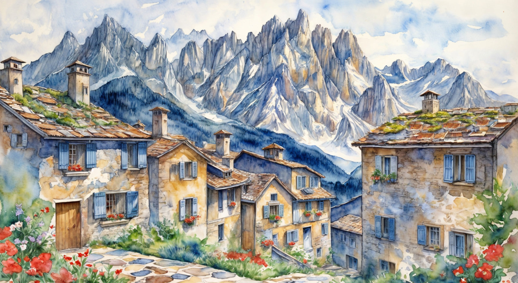 Mountain village wallpaper with snow capped peaks and green valleys