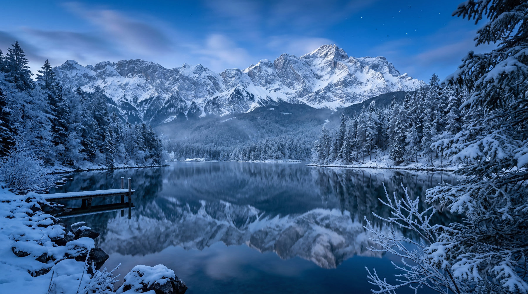 Panoramic winter lake artwork for Alpine Winter Reflection wall mural