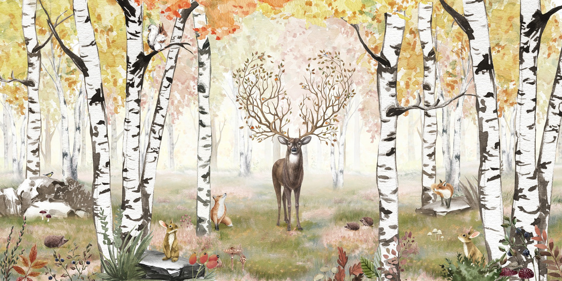 Take a walk on the wild side as the magic of the woods is brought to life with our amazing antlers autumn wallpaper mural! This animal wallpaper mural is a transformation of any child's room, which creates an enchanted woodland armchair and implores the little creatures to step into a world of majesty, where magnificent stags stand at the forefront of a woodland party, among a group of woodland friends. Made by exquisitely water colorized painting, the mural bristles with orange, gold and autumnal glory straight from a fairytale. All details, from the majestic antlers of the noble deer to the curious ones of hedgehogs, playful foxes, rabbits, and birds singing, are all drawn to inspire and wonder. And ideal for nurseries, playrooms, or bedrooms, this wallpaper is the portal to nature adventures. Indulge in the beauty of the woods and the pleasure of changing seasons. Let the Amazing Antlers Autumn Wallpaper Mural bring your child the daily discovery of beauty and wonder.