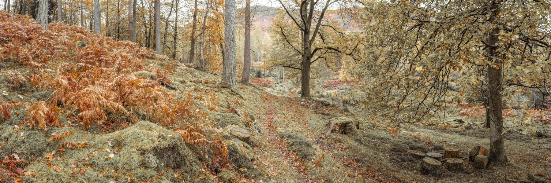 Pathway through Autumn forest. Step into a golden autumn scene with this nature-inspired wallpaper. It features a forest path blanketed in fallen leaves, edged by vibrant rust ferns and mossy ground. The soft, muted color palette gives a soothing effect. This wallpaper for walls brings a touch of the outdoors inside, making it a great fit for a bedroom, living room, or even a home office. The organic design complements a variety of interior styles with its warm, inviting atmosphere.