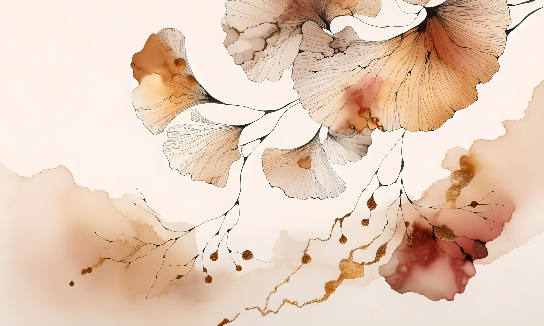 This ethereal wallpaper showcases a delicate watercolor and ink artwork featuring stylized Ginkgo biloba leaves. The leaves are rendered in soft beige and brown hues, their intricate vein structures highlighted by fine black lines. Elegant gold accents flow throughout the composition, adding a touch of luxurious sparkle. The overall effect is serene and calming, creating a sophisticated atmosphere perfect for a living room, bedroom, or home office. The subtle color palette and flowing lines promote a feeling of tranquility and peaceful contemplation, making this wallpaper a beautiful addition to any space.