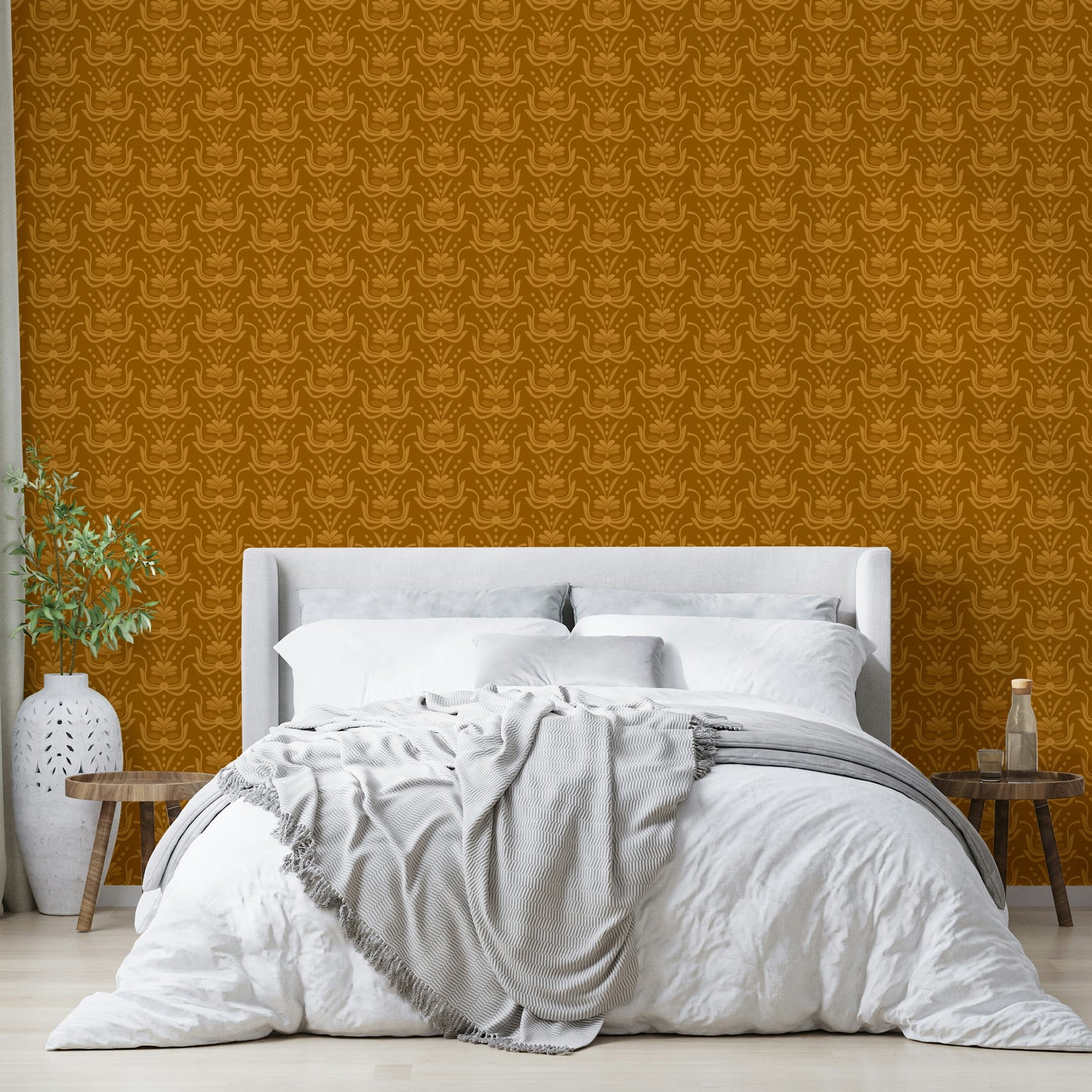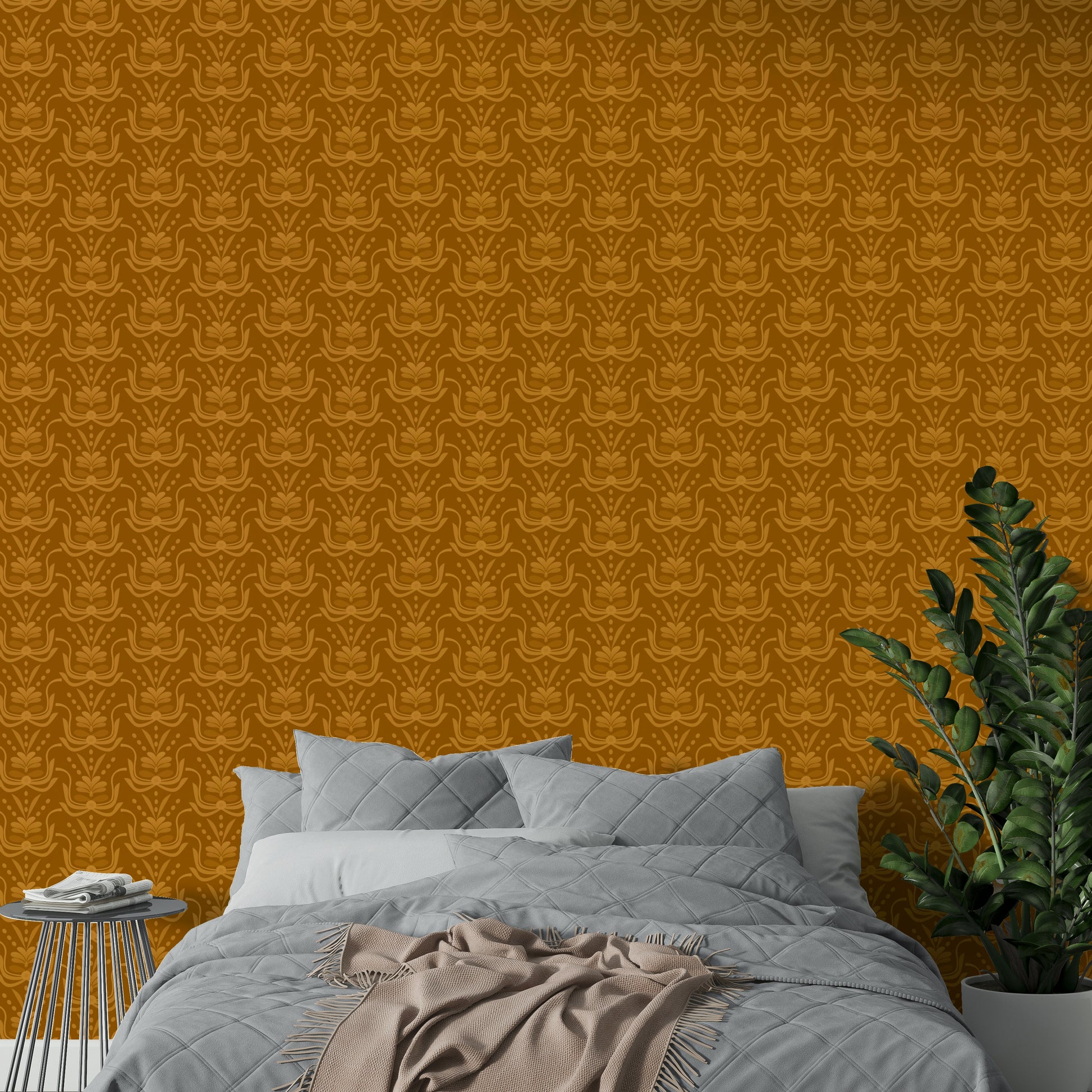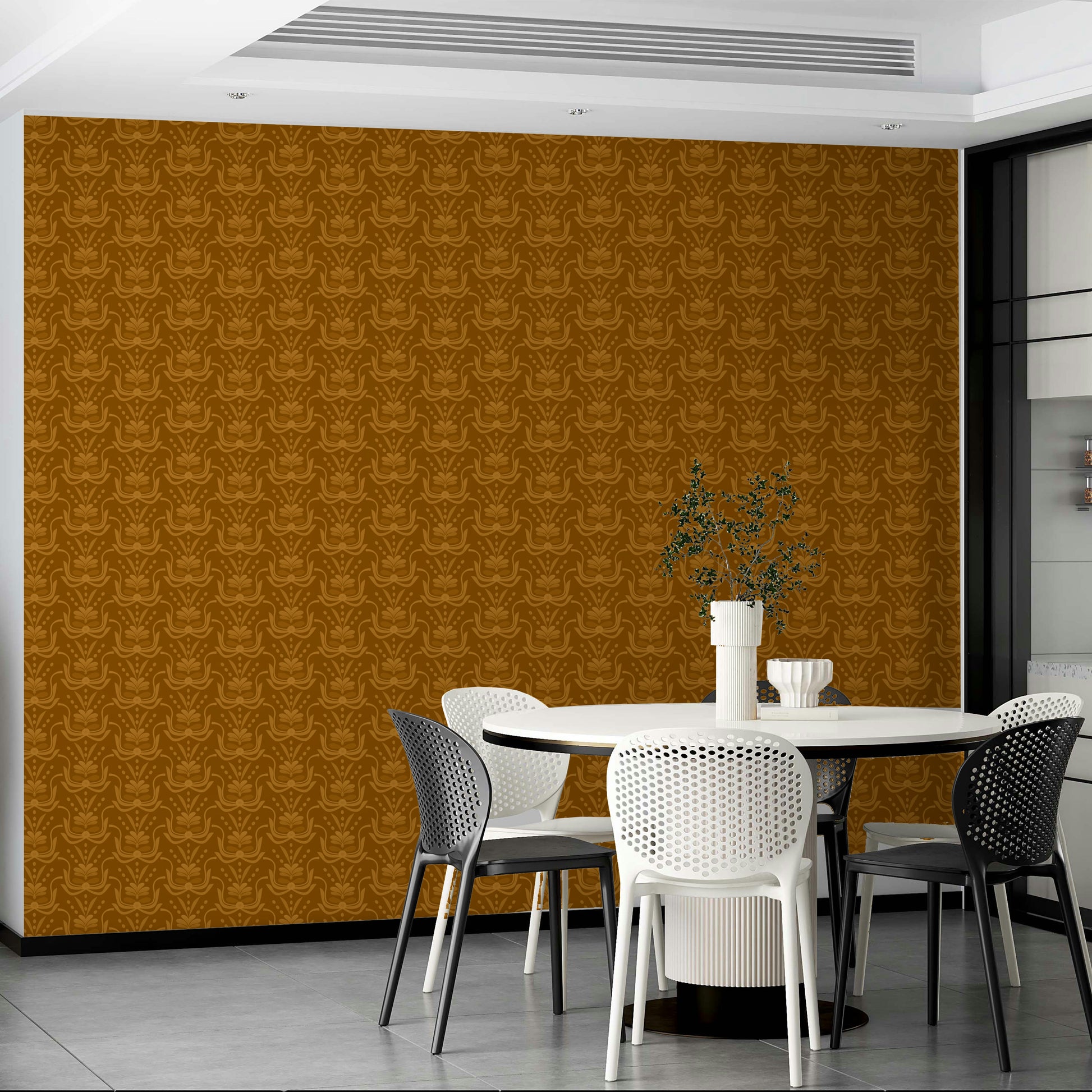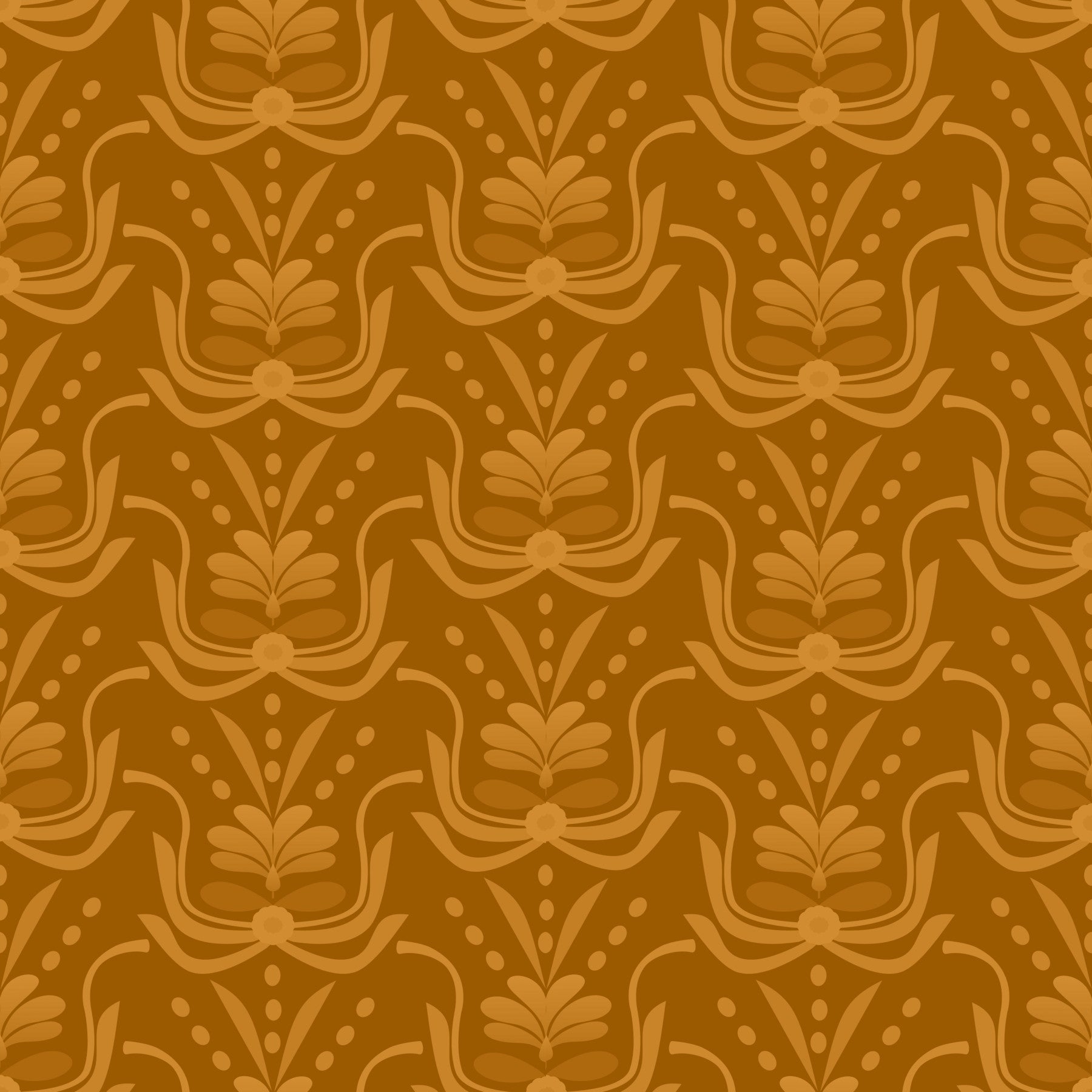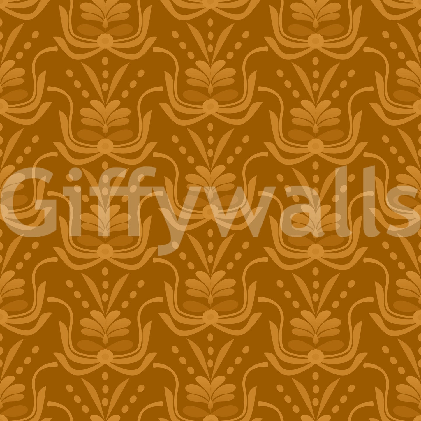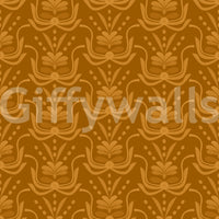 This wallpaper showcases a captivating seamless pattern of stylized floral motifs in warm amber tones. The design, reminiscent of Art Deco elegance with a modern twist, features a rich, saturated brown backdrop that accentuates the lighter, almost ochre-like floral elements. The repeating pattern creates a sense of sophisticated rhythm and visual harmony, making it suitable for various interior spaces. The overall effect is one of warmth, understated luxury, and timeless style, perfect for adding a touch of refined elegance to any room.