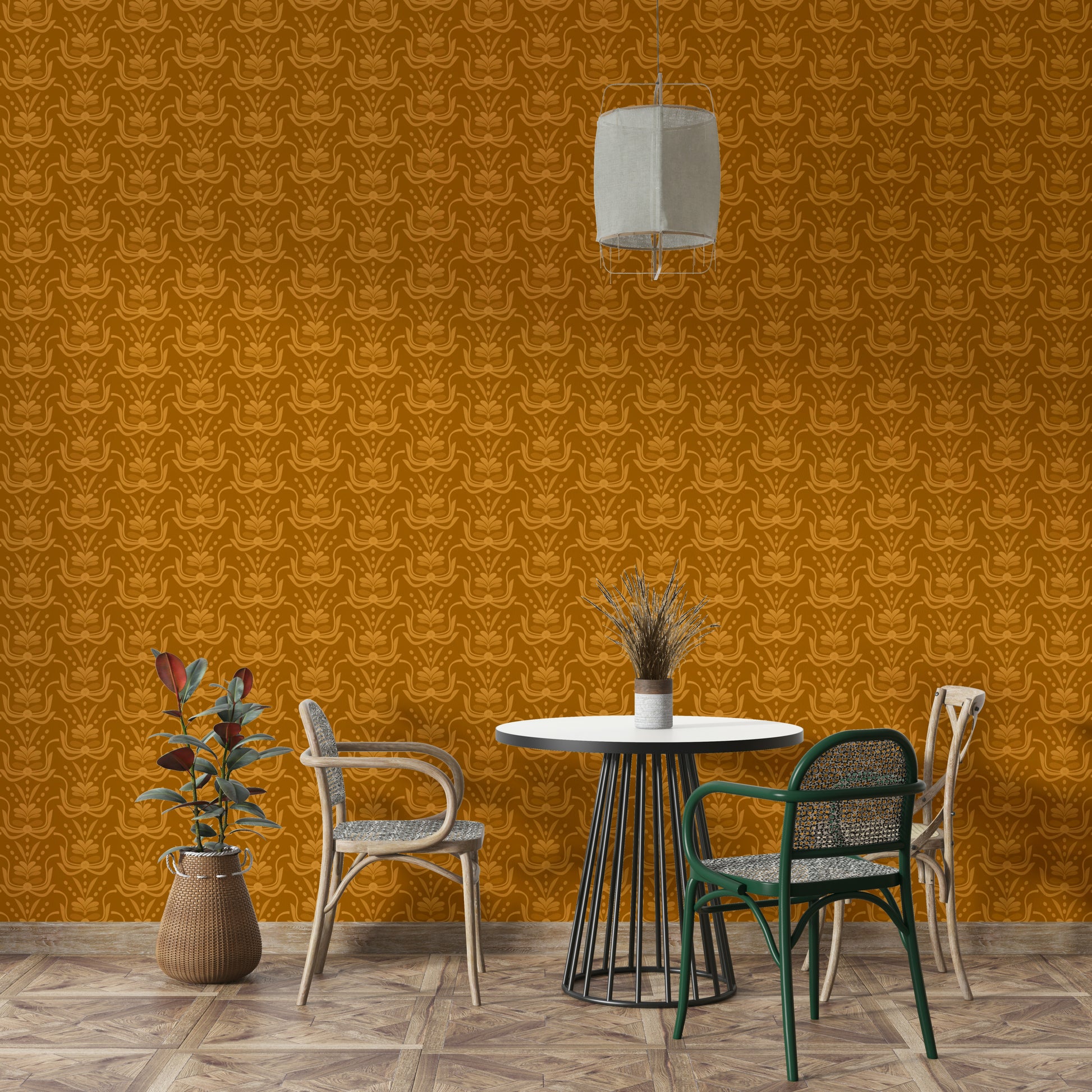 Classic floral wallpaper in amber tones
