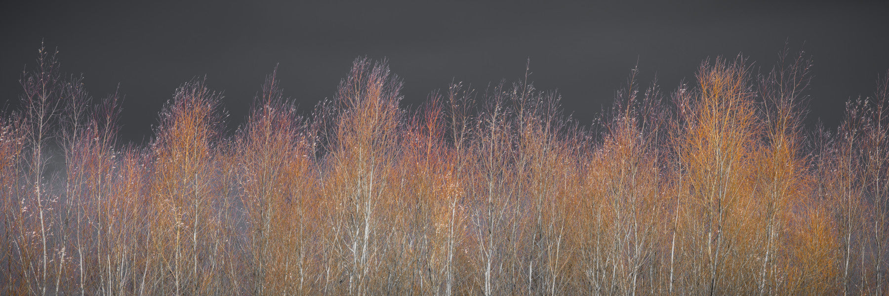 Trees in a row. Step into a serene forest at twilight with this wallpaper for walls. Bare trees glow in shades of amber and copper against a muted gray sky. The design offers a tranquil backdrop, ideal for a bedroom or living room. The soft color palette creates a calming atmosphere, while the vertical lines add a sense of height. This wallpaper introduces nature's beauty indoors and brings a touch of sophistication and organic charm to your space. It provides a calm visual that works well in meditation spaces, bedrooms, or living rooms.