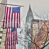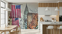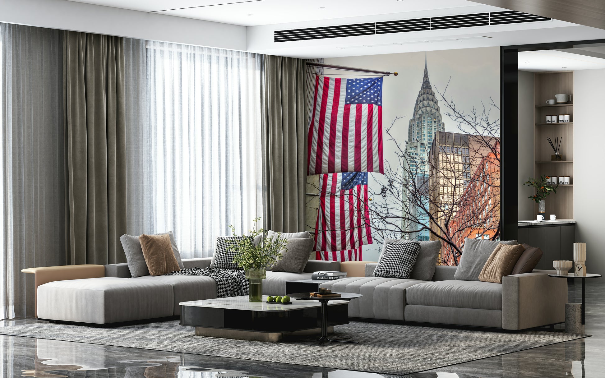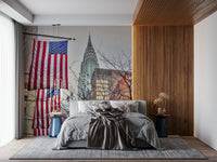 Bring the spirit of New York City to your walls with this inspiring wallpaper. The iconic Chrysler Building stands tall, juxtaposed with the waving American flag. The soft grays, reds, and blues offer a calming yet dynamic visual. Ideal for a study, living room, or even a bedroom, this wallpaper for walls infuses a space with a sense of urban sophistication. Its blend of patriotic symbols and architectural marvels enhances interior aesthetics, creating a unique and stylish atmosphere. Welcome the American Dream into your everyday life.