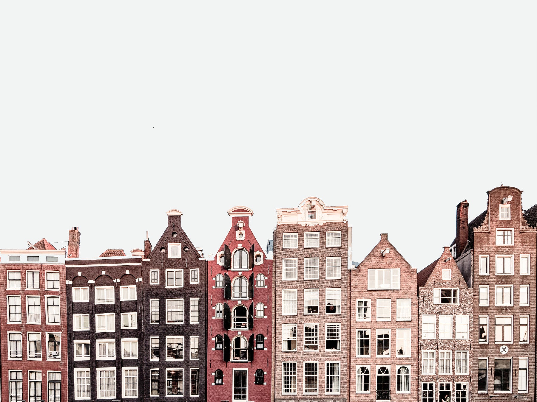 This wallpaper features a captivating row of charming canal houses, typical of Amsterdam's architecture. The image showcases a palette of warm, earthy tones, predominantly reds, browns, and blacks, creating a sense of classic European charm. The clean lines of the buildings and the minimalist white background highlight the architectural details of each unique house. It evokes a feeling of serenity and timeless elegance, perfect for adding a touch of sophisticated European style to any room.