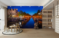 Evening view of Amsterdam city and canals. Bring the serene beauty of Amsterdam's canals at night to your home. This detailed image showcases the city's historic architecture, charming bridges, and tranquil waterways illuminated under a deep blue sky. Warm light pours from the windows, creating a cozy atmosphere. Use this wallpaper for walls to introduce a touch of European elegance to living rooms, bedrooms, or even a home office. The rich colors and reflections add depth and visual interest, perfectly complementing modern interiors.