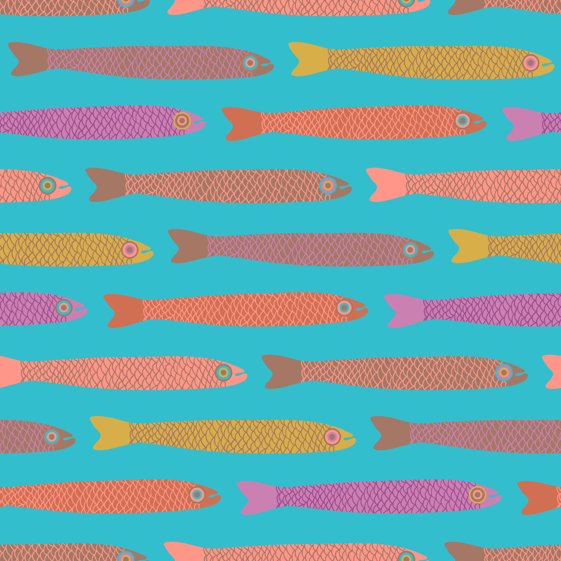 Dive into a sea of retro charm with Anchovies a whimsical wallpaper that brings a splash of playful energy to any space. This delightful design features a school of stylized fish swimming across a vibrant blue backdrop, reminiscent of a vintage seaside postcard. Each fish boasts a unique hue, from sunny yellows to dusty rose, with subtle 'mocha mousse brown' accents adding a touch of warmth and sophistication. With its retro flair and cheerful color palette, this wallpaper is sure to bring a smile to your face and transform your room into a haven of vintage-inspired fun. Ideal for kitchens, bathrooms, or children's rooms, this repeating pattern evokes a sense of nostalgia while remaining fresh and contemporary. This pattern design is also available in Other Colourways AND in a wall mural version too! Original wallpaper pattern design by Jackie Tahara of UnBlink Studio.