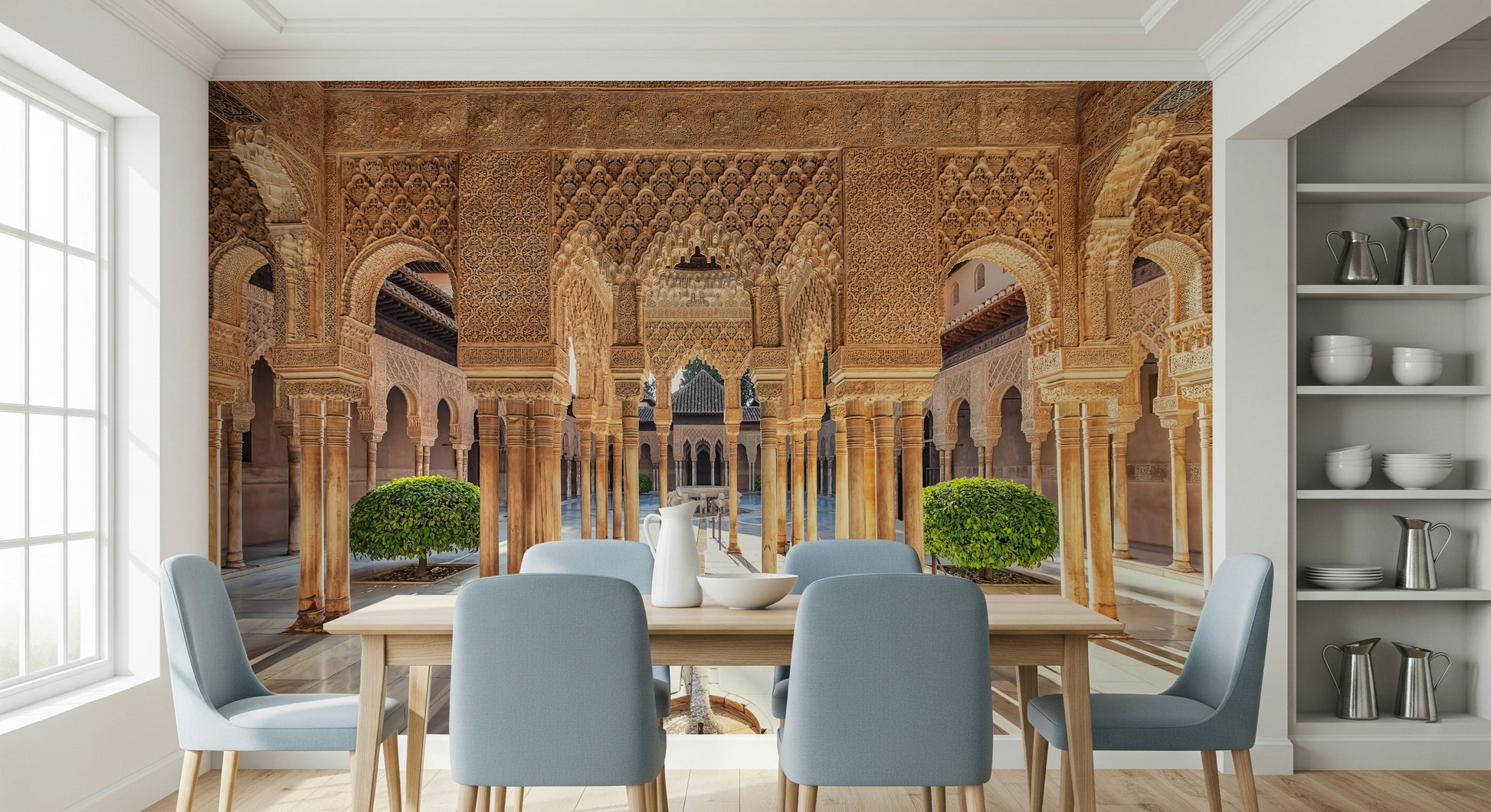 Bring a sense of history to your home with this architectural wallpaper. The design shows a beautiful courtyard with intricate archways and meticulously detailed stonework. Soft light and greenery add tranquility, perfect for a study, bedroom, or hallway. The warm beige tones complement a variety of interiors. This wallpaper for walls gives your rooms a touch of regal charm, acting as a conversation starter and setting a mood of sophisticated grace. The design merges nature with art, creating an atmosphere that is both inviting and inspiring.