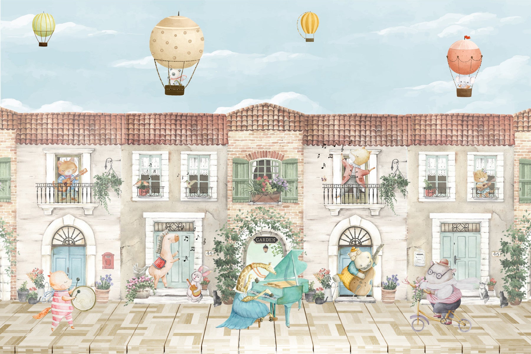 Bring whimsical music to your walls! This wallpaper features animal musicians enjoying a concert on a European-style street. Hot air balloons float above, adding a sense of adventure. Soft pastel colors of peach, blue, and green create a cheerful atmosphere. It is ideal for a kid's room, nursery, or playroom, and the charming design adds a touch of playful sophistication. Choose this delightful wallpaper for walls to create a welcoming and fun interior.