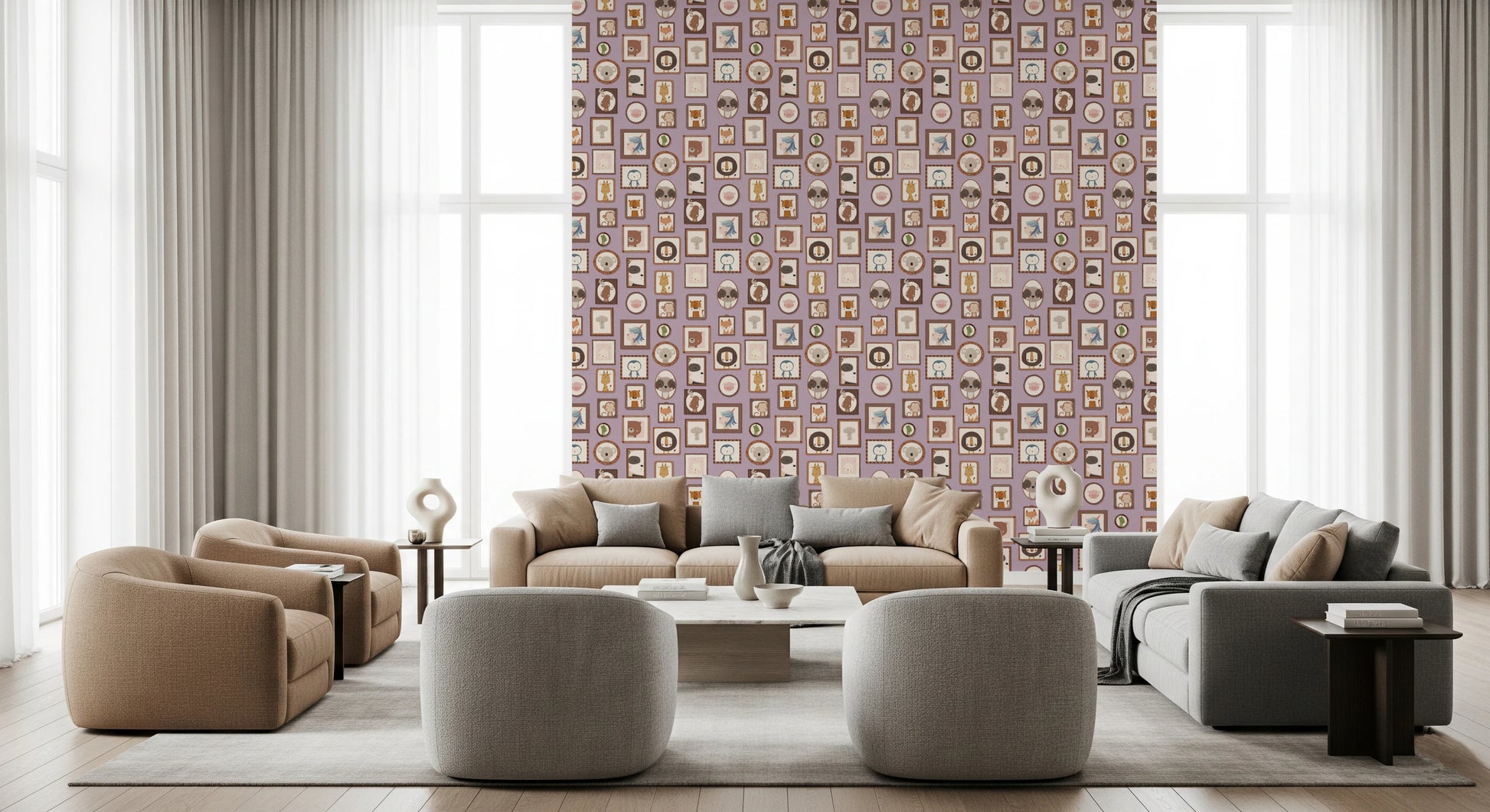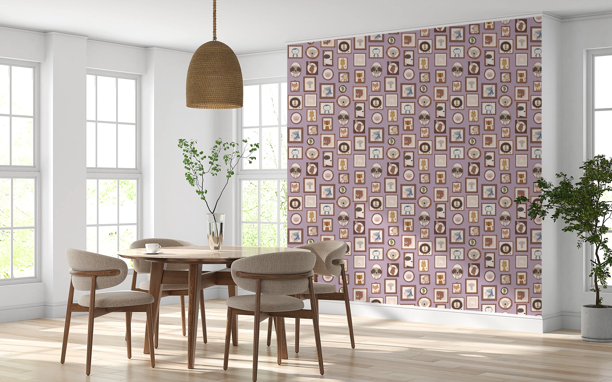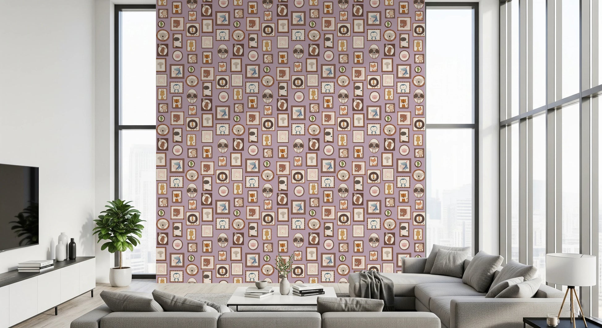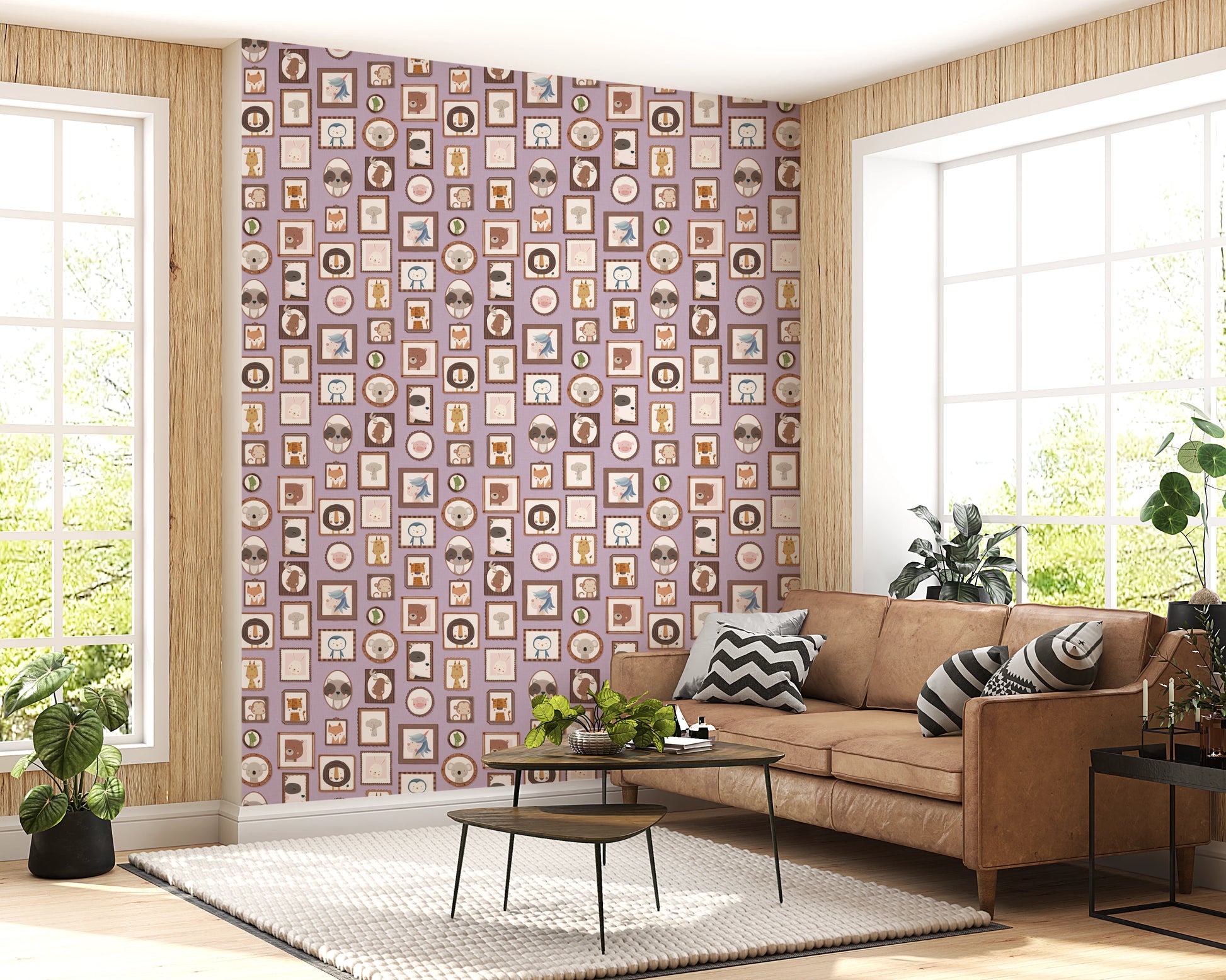 Transform your walls with this charming collection of framed animal portraits. The design showcases a variety of cute creatures, including lions, bears, penguins, and unicorns, each presented in a unique, decorative frame. The soft color palette of lilac, beige, and brown creates a calming and inviting atmosphere. This wallpaper for walls is ideal for kids' rooms, nurseries, or playrooms. It adds a touch of whimsy and sophistication while enhancing the overall décor with its adorable characters and delightful arrangement. Instantly create a cozy and playful space.