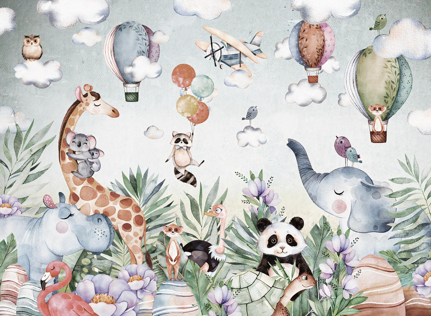 The jungle safari dreamscape mural wallpaper is a dramatic installation for any playroom that seeks excitement. This cartoon jungle safari wallpaper is visually stimulating and brings a sense of excitement and imagination to the room. No matter how much your child wants to pretend they are on an adventure in the jungle with their favorite animal or are on a safari expedition, this wallpaper creates a playground for days and days of imagination. Give the mind of a child-free rein with this lighthearted, merry children's wallpaper. The touch of the green foliage and exotic animals gives the authentic feel of being transported into a dreamscape.