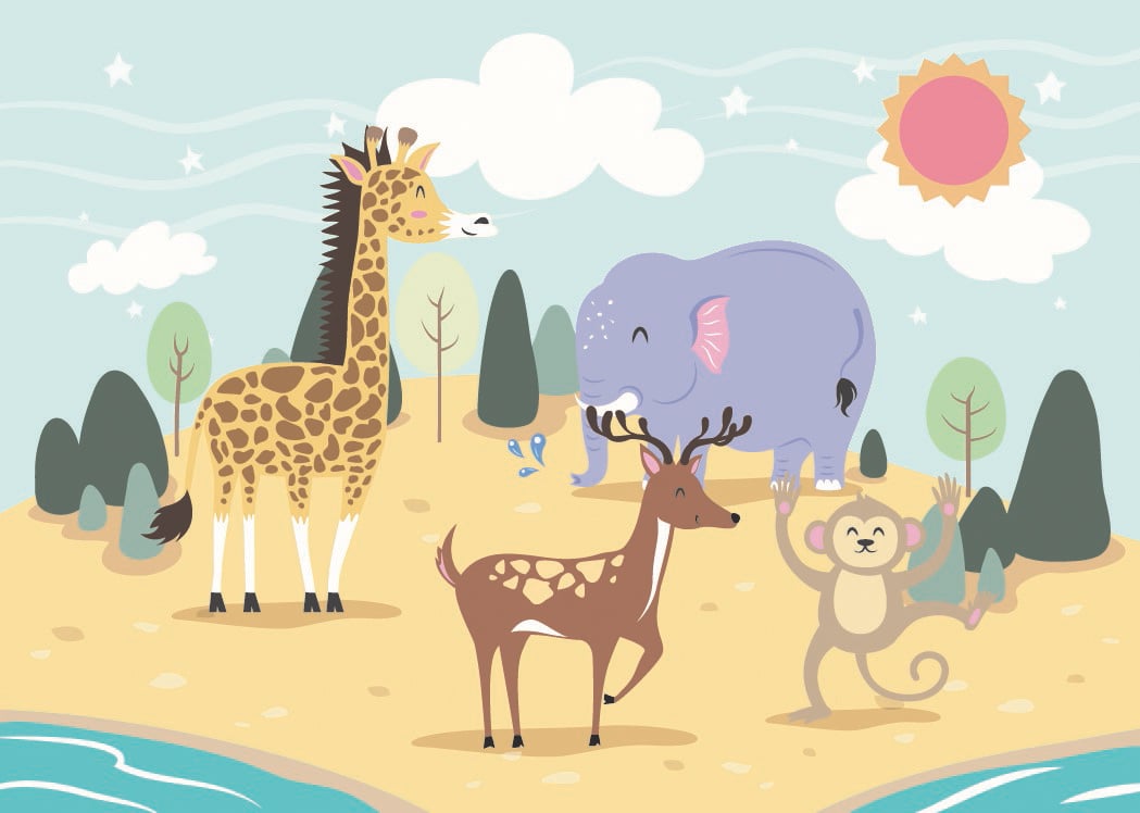 Kids Room Animal Playing on Island Cartoon Wallpaper