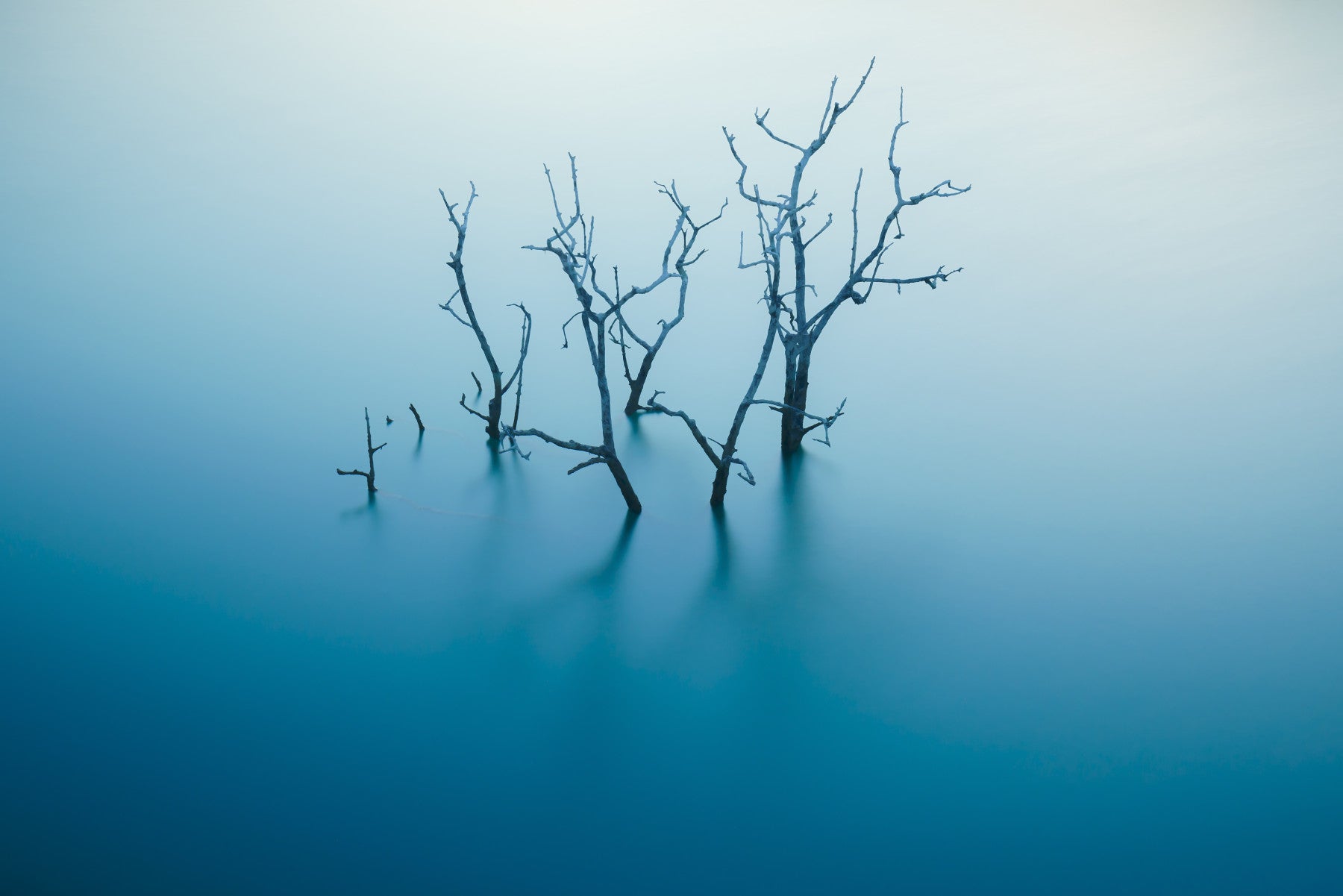 Elevate your home ambiance with this striking wallpaper for walls showcasing skeletal trees mirrored in a serene blue lake. The calming palette and minimalist composition transform any room into a peaceful oasis. Picture this design enhancing a living room, bedroom or home office with subtle grace. Its sophisticated style makes it a great addition to contemporary settings. Enjoy a calming effect; the blend of hues promotes relaxation and serenity, easily complementing any interior space.