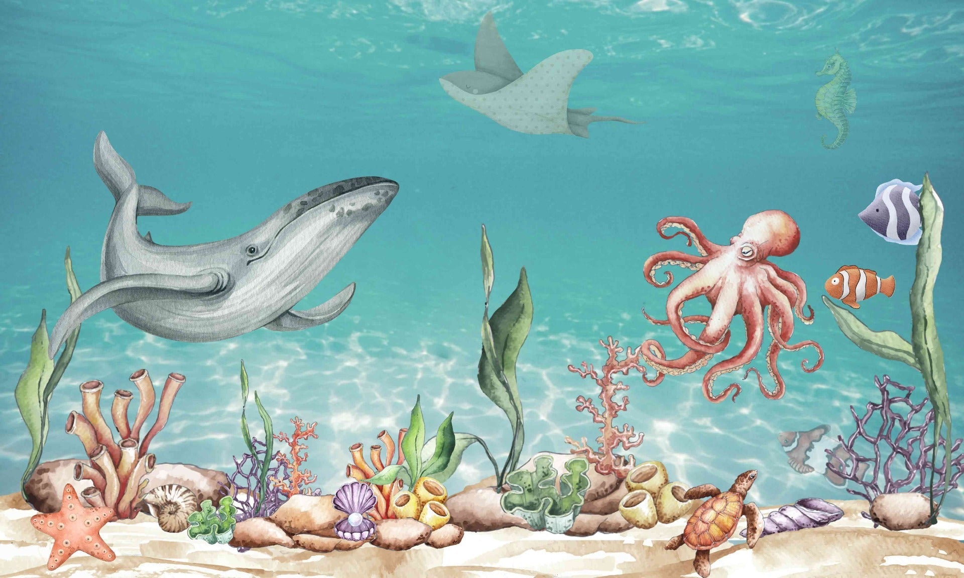 Get your child immersed in an underwater journey with our kids room wallpaper, aquatic harmony. A mural wall full of sea creatures and the ocean's bustling life force is all-consuming. This image is a story where your child will have endless tales of the deep角逐 with the theme having whales, octopuses and sea turtles. Indeed, every critter hand illustrated to get the energy of life at 0 feet, so this is a prime spot to play or do some dreamin'. Transform your child's room into a marine wonderland, where they can be a little boy or girl and play with the abundance that the ocean has in store.