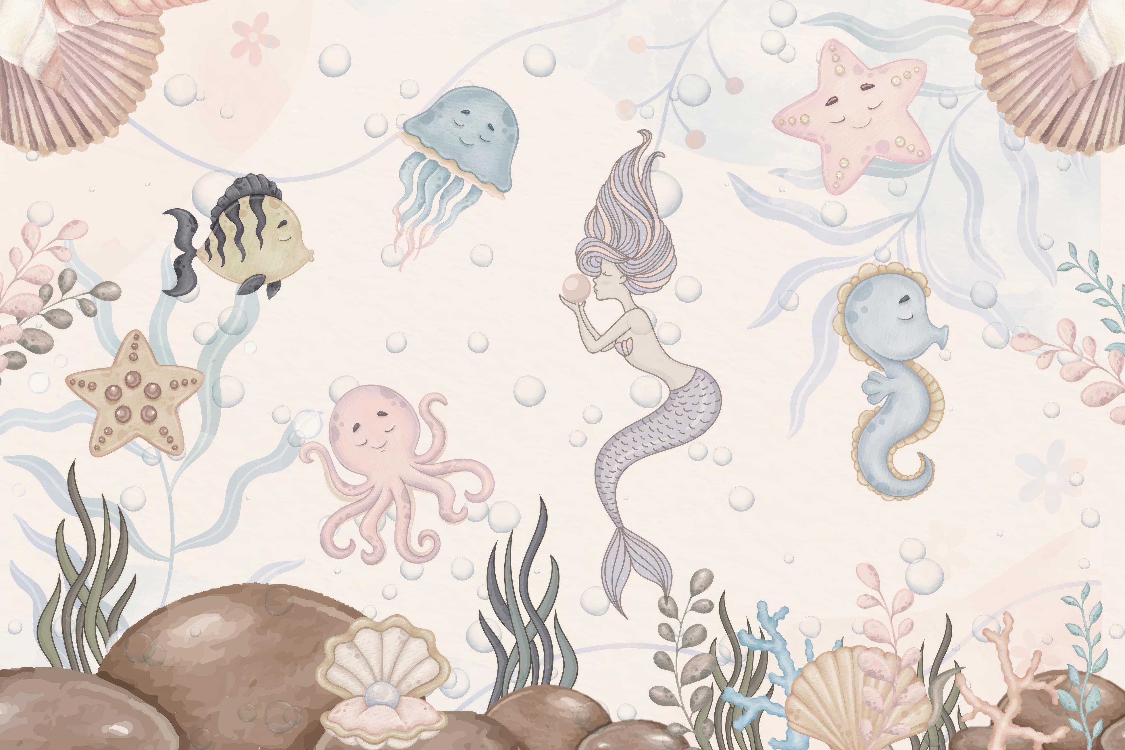 Get creative with our nursery wallpaper featuring an aquatic playland mural. An excellent addition to any child's bedroom or play area, this mural features a lively ensemble of underwater characters sure to spark joy and wonder in any young child. The complex designs feature everything from jellyfish with soft, flowing tentacles to mysterious seahorses. Each creature is designed to inspire stories and play, helping children develop their narrative skills and creativity. The soothing colours and gentle motion depicted in the mural provide a calm yet stimulating backdrop, perfect for nurturing young minds.