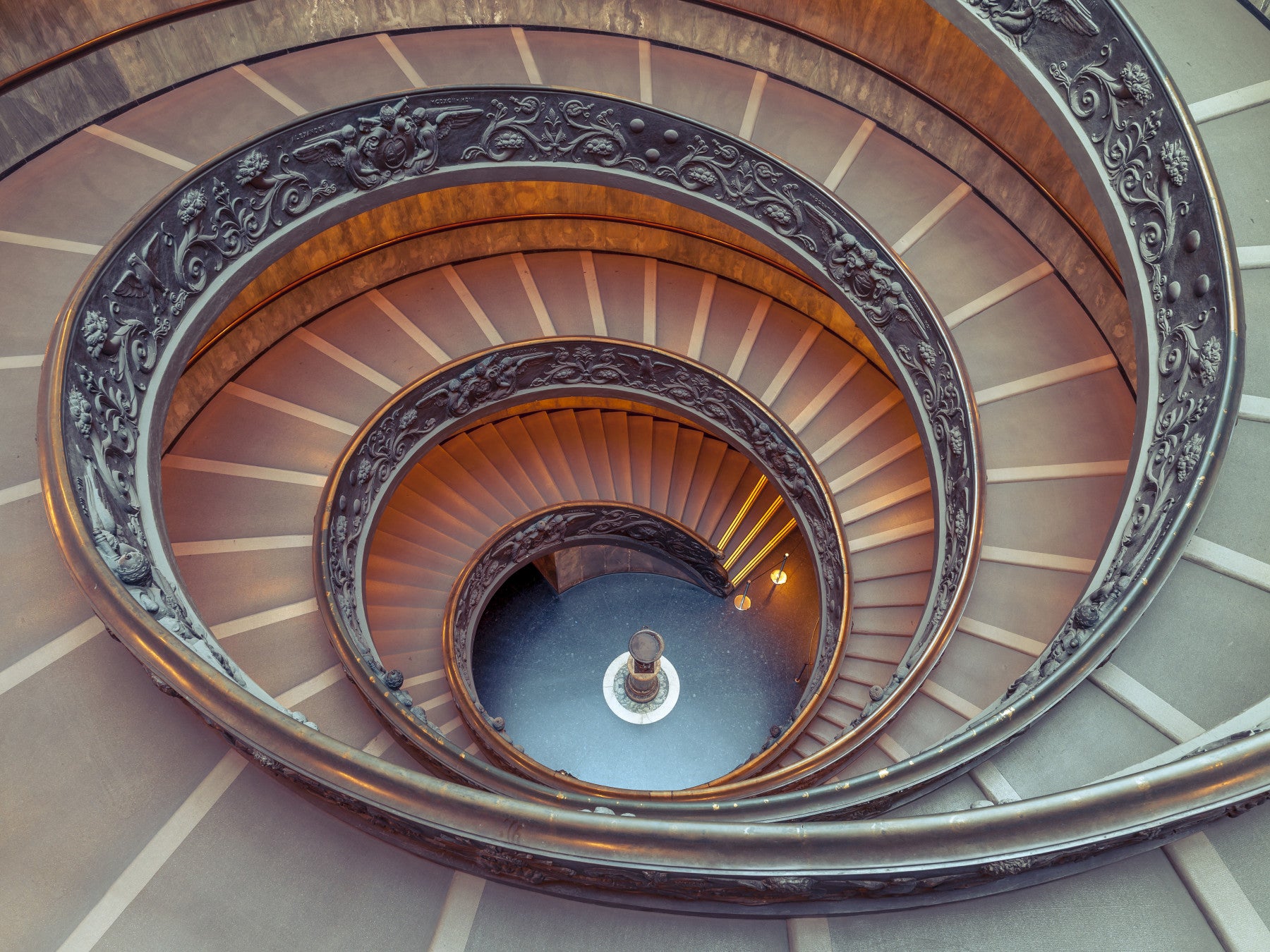 Experience the grandeur of architectural design with this wallpaper featuring a captivating spiral staircase. The image's overhead perspective unveils the intricate beauty of the staircase's bronze railing, embellished with finely crafted cherubs and swirling floral patterns. The warm lighting enhances the texture and color of the stone steps, creating a sophisticated and inviting atmosphere. This visually stunning wallpaper exudes timeless elegance, perfectly blending classic and modern aesthetics. The rich tones of beige and brown create a sense of calm and tranquility, making it ideal for enhancing the ambiance of various living spaces. Its intricate detail and grand scale will transform any wall into a focal point of refined taste and sophisticated design.