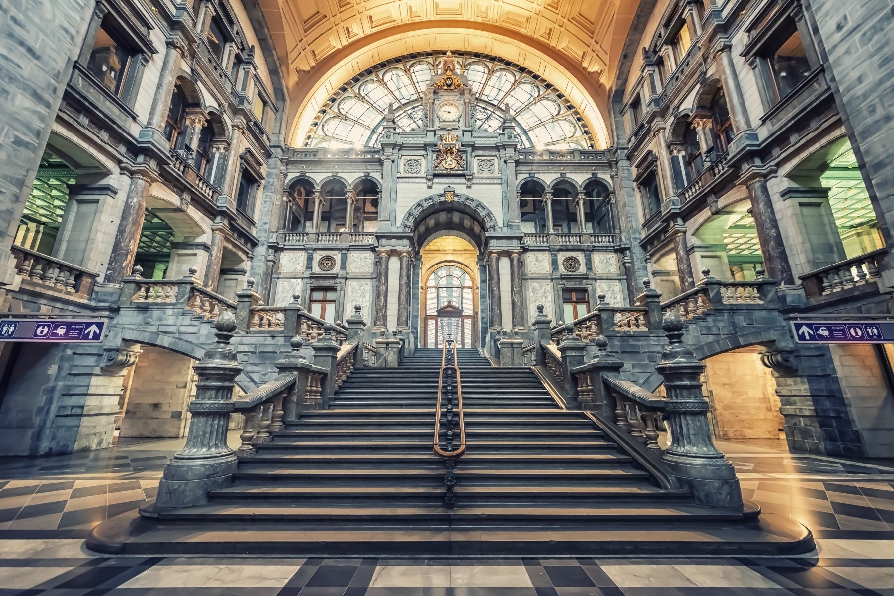 Adorn your walls with architectural grandeur with this unique wallpaper for walls. The image features a majestic hall with sweeping staircases, intricate stone work, and stunning arched features. A clock sits beneath a large arched window. The color palette features grays with warm golden undertones, creating a balanced and luxurious visual. Ideal for studies, living rooms, or large hallways, this design will bring a stately ambiance to any room. Enhance your interior decor by turning your walls into a work of art that embodies both classic elegance and timeless beauty. The wallpaper complements spaces with high ceilings or classic furnishings.