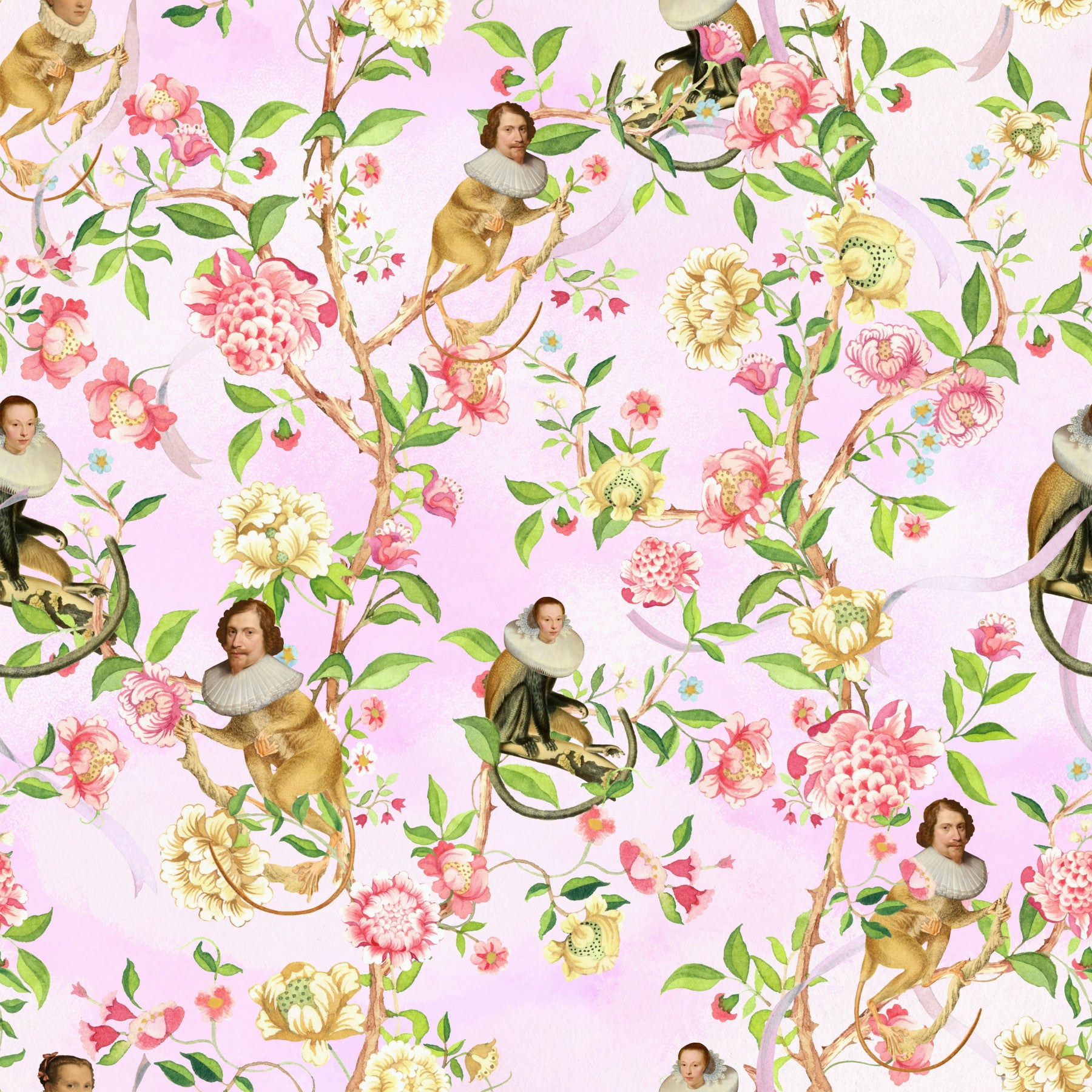 This whimsical wallpaper design features a delightful juxtaposition of 17th-century aristocratic portraits seamlessly integrated onto the bodies of playful monkeys. They are depicted amidst a vibrant watercolor floral tapestry of peonies, roses, and other blossoms in delicate shades of pink, cream, and yellow. The pastel pink background enhances the overall soft, romantic, and slightly surreal mood. This unique blend of historical imagery and nature creates an unexpected and captivating visual narrative, perfect for adding a touch of quirky elegance to any space. The intricate detail of both the portraits and the floral elements ensures a rich and visually engaging design.
