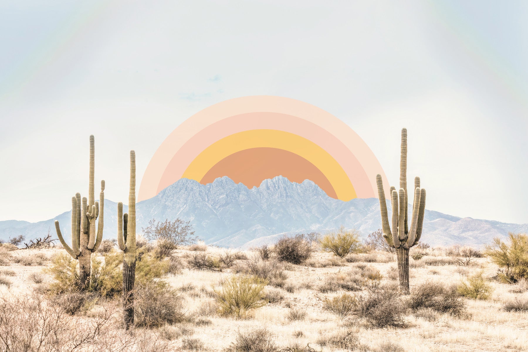 Capture the serene beauty of an Arizona sunrise with this breathtaking wallpaper. Towering saguaro cacti stand sentinel against a backdrop of majestic mountains, bathed in the soft, pastel hues of a rising sun. A stylized rainbow-like effect overlays the sun, adding a touch of artistic flair to this minimalist desert landscape. The calm, muted tones evoke a sense of peace and tranquility, making it the perfect addition to any space seeking a touch of southwestern charm and modern aesthetic.